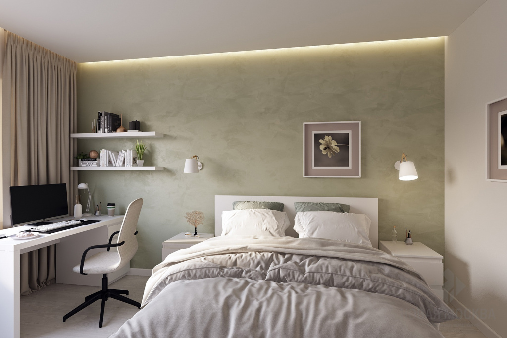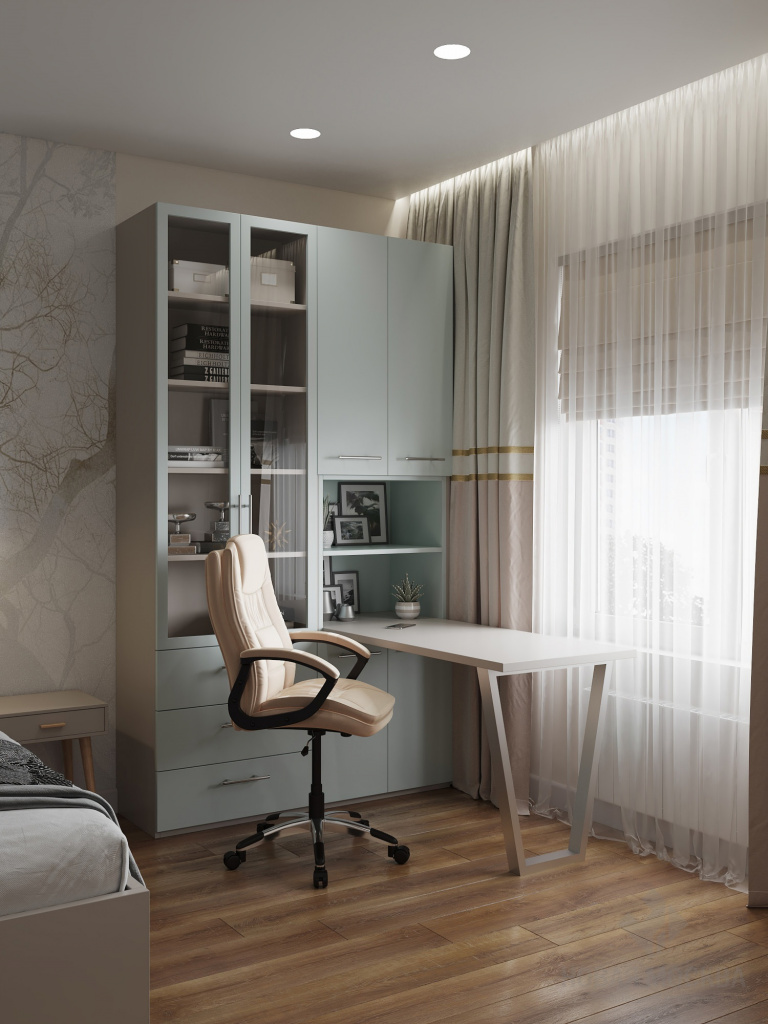 Удобный рабочий уголок в спальне двухкомнатной квартиры в ЖК «Лучи»: https://clck.ru/35h94S