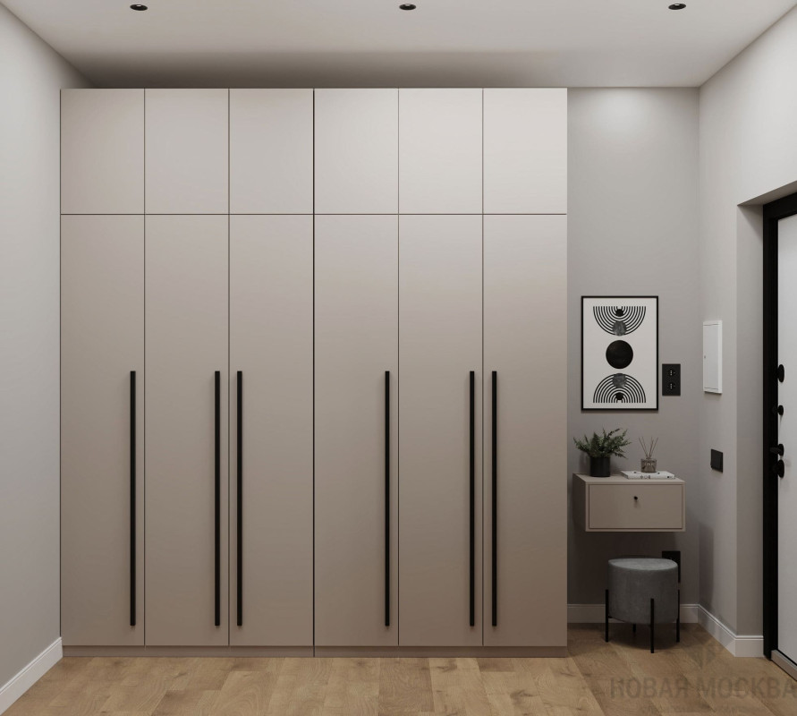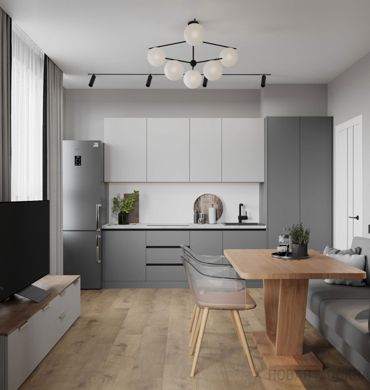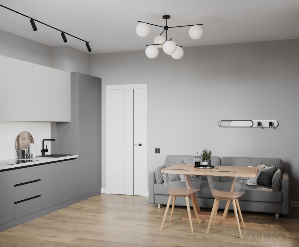 Спокойная гамма — логичный выбор для инвестиционного жилья. Комбинацию бежевого, серого и белого дополняют деликатные черные акценты. Деревянные поверхности и текстильная обивка мебели делают пространство теплым и уютным. Рифленые фасады тумб и шкафов задают визуальный ритм и оживляют нейтральный характер интерьера.