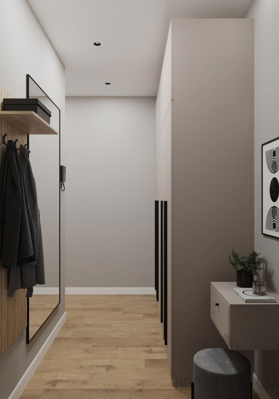 На площади 59 кв. м разместились прихожая, два санузла, кухня-гостиная, спальня и детская. В каждом помещении удалось выделить функциональные зоны, продумать меблировку и оборудование с учетом планового бюджета проекта. Не обделены вниманием вопросы хранения: в прихожей, гостиной, спальне и детской предусмотрены шкафы и тумбы, на кухне запланирована установка вместительного гарнитура со всей необходимой техникой. В малом санузле установлен шкаф для хранения бытовой химии, на лоджии — стеллаж для дополнительного хранения.