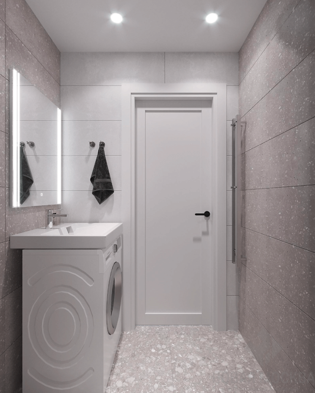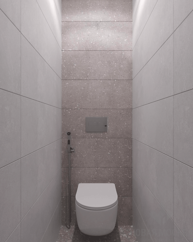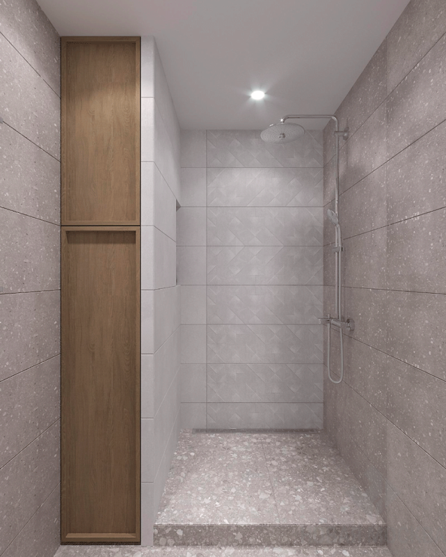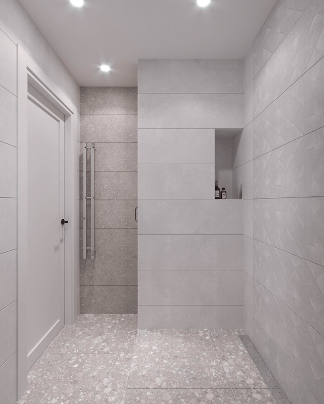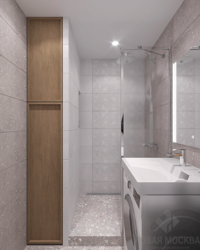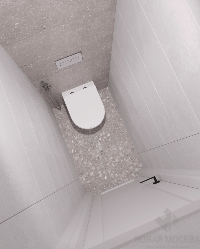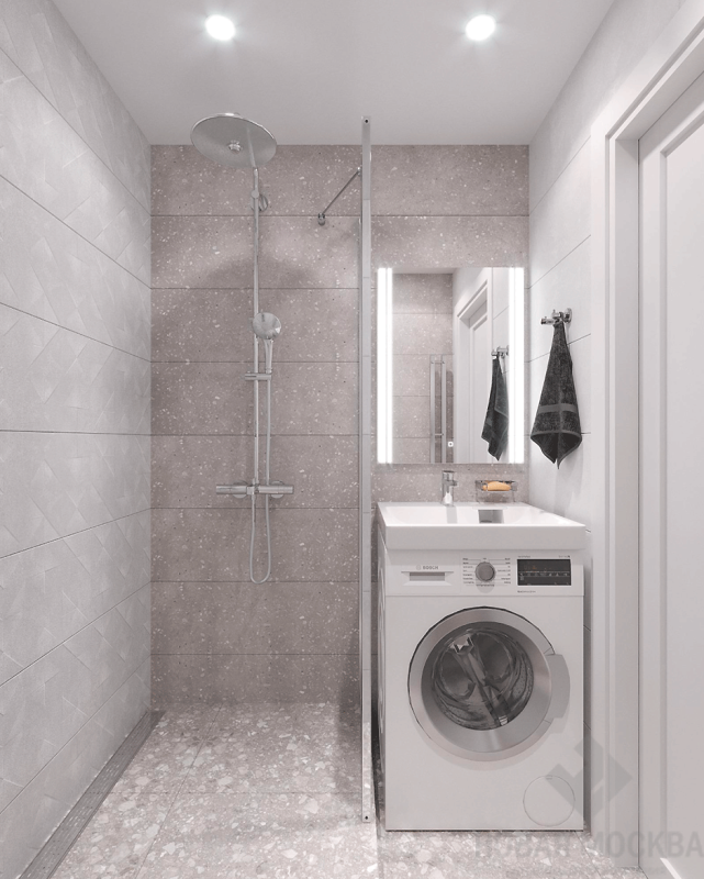 Для душевой и туалета выбрали нейтральную бежевую гамму, идею близости к природе подчеркнули напольным покрытием с фактурой терраццо.