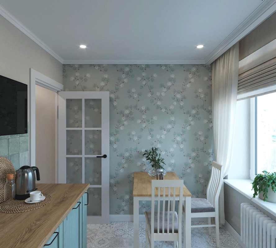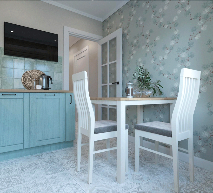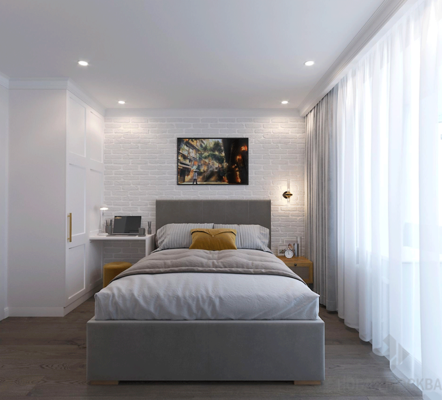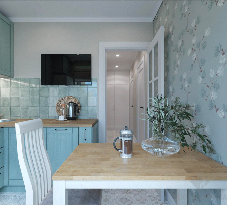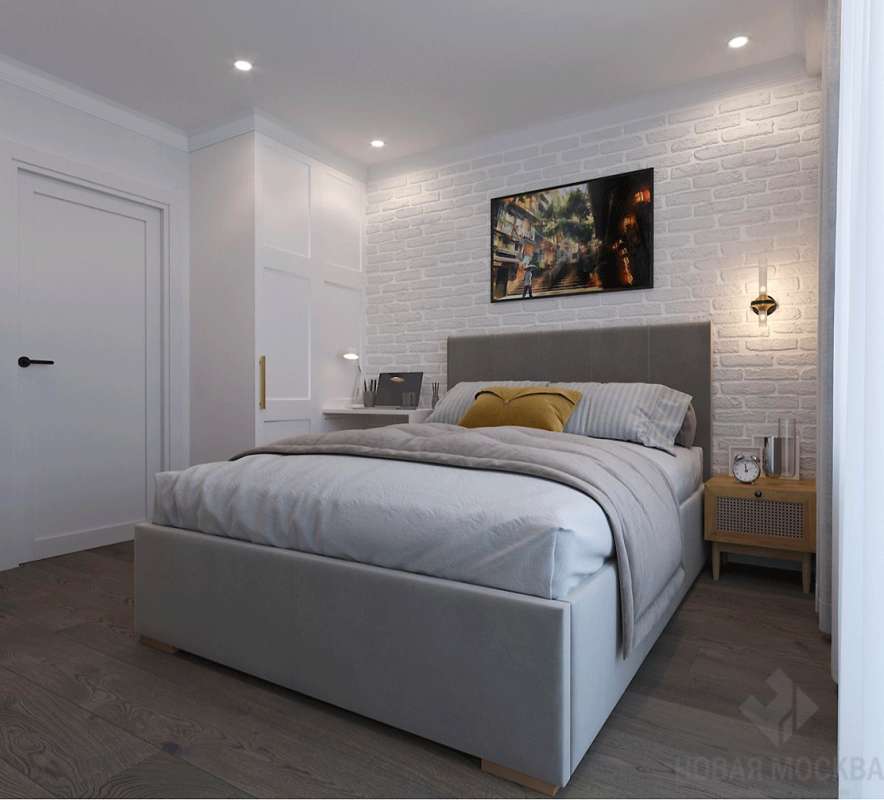 Интерьер выполнен в пастельных оттенках. Дизайнер деликатно ввел в пространство приметы выбранного стиля: напольную плитку с характерным орнаментом, обои с цветочным рисунком, имитацию кирпичной кладки в изголовье кровати. Деревянные поверхности пола и мебели дополняют атмосферу милой простоты и натуральности. Обилие белого цвета создает ощущение чистоты, свежести и простора, несмотря на скромные размеры жилья.