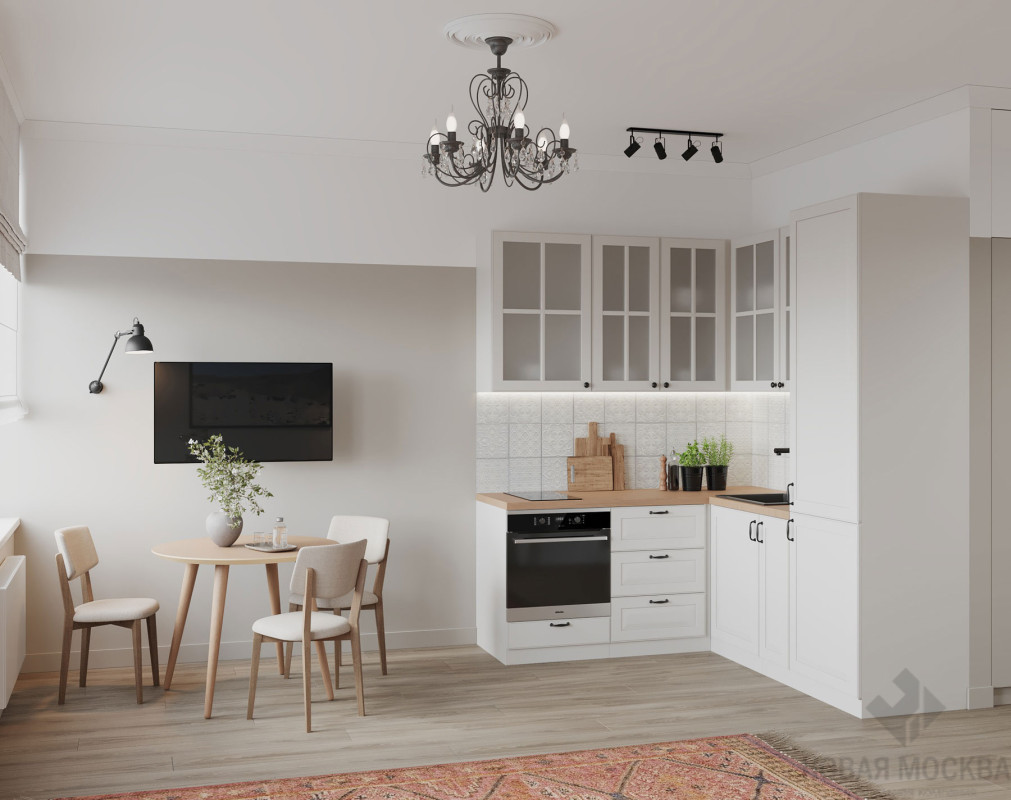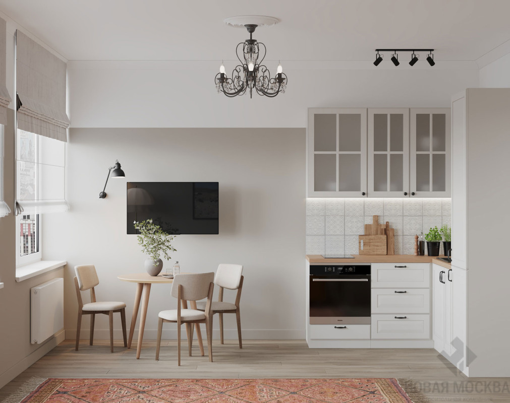 Единая отделка стен и пола и отсутствие резких контрастов создают ощущение простора на скромной площади студии. Фасады встроенных шкафов и кухонный гарнитур выполнены в тон стен и «растворяются» в пространстве. На ощущение легкости, необходимой компактному жилью, работает способ покраски стен: широкий отступ в цвет потолка зрительно поднимает потолок и вносит ощущение свежести.