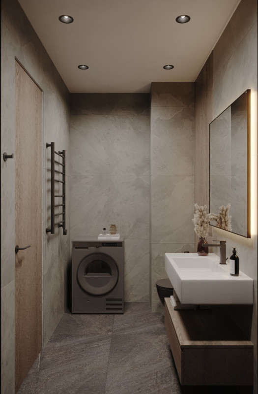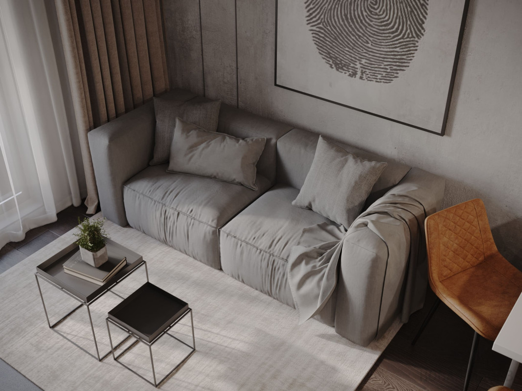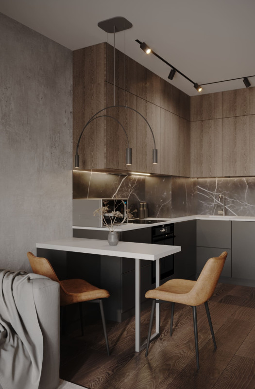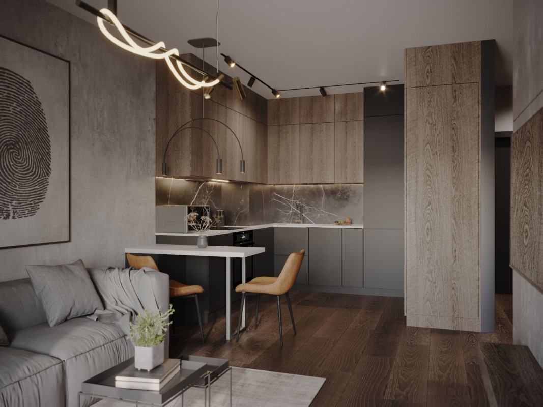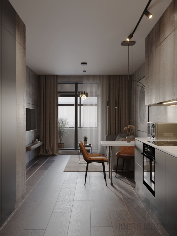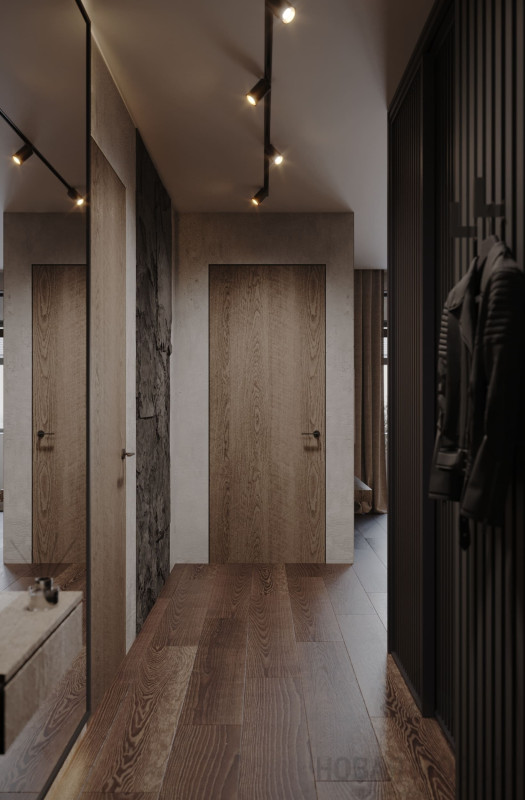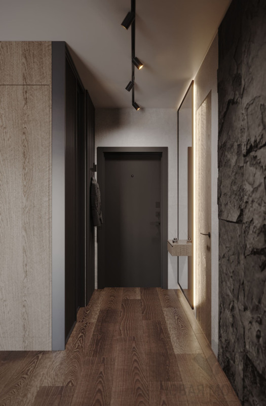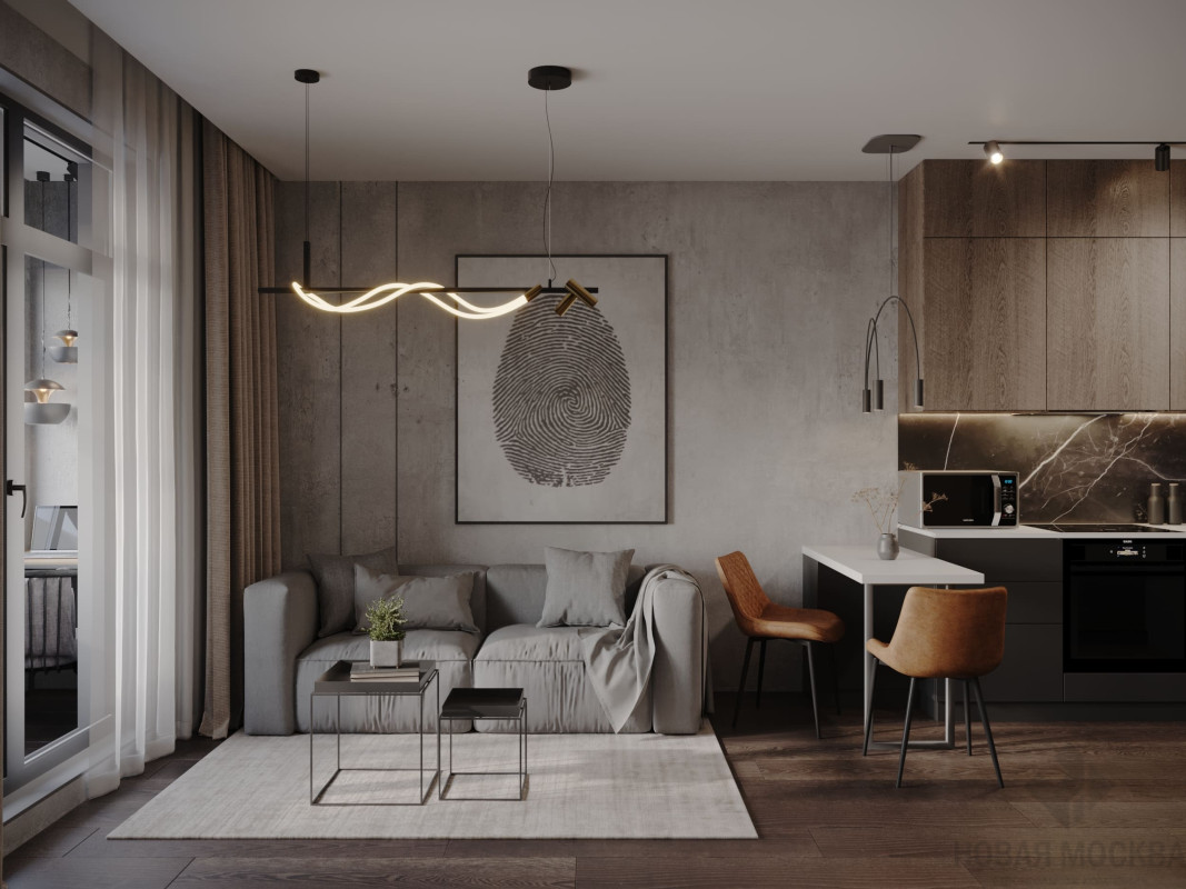 Цветовой основой интерьера стали серые и коричневые оттенки. Сдержанная гамма гармонично сочетается с брутальными деталями: стены отделаны декоративной штукатуркой под бетон, во входной зоне запланировано панно из каменного шпона. При этом квартира не выглядит мрачной: дизайнеру удалось выдержать баланс светлых и темных, холодных и теплых оттенков. Четкие линии сочетаются с плавными формами мебели и мягкостью текстиля, к фактурным элементам отделки и декора хочется прикасаться. Деревянные поверхности и акцентная подсветка создают атмосферу камерности и уюта.