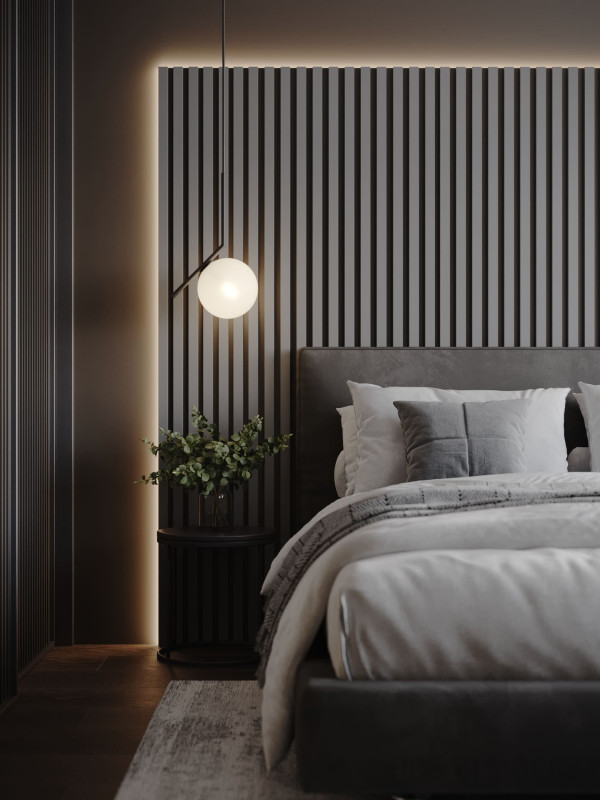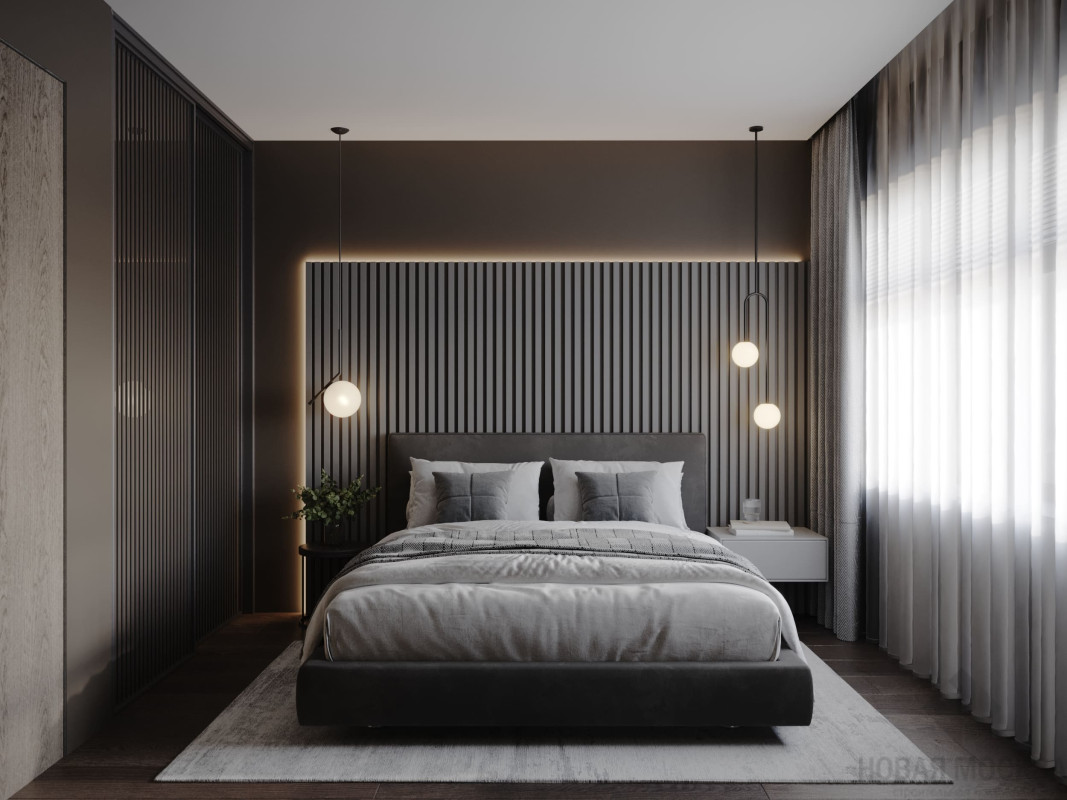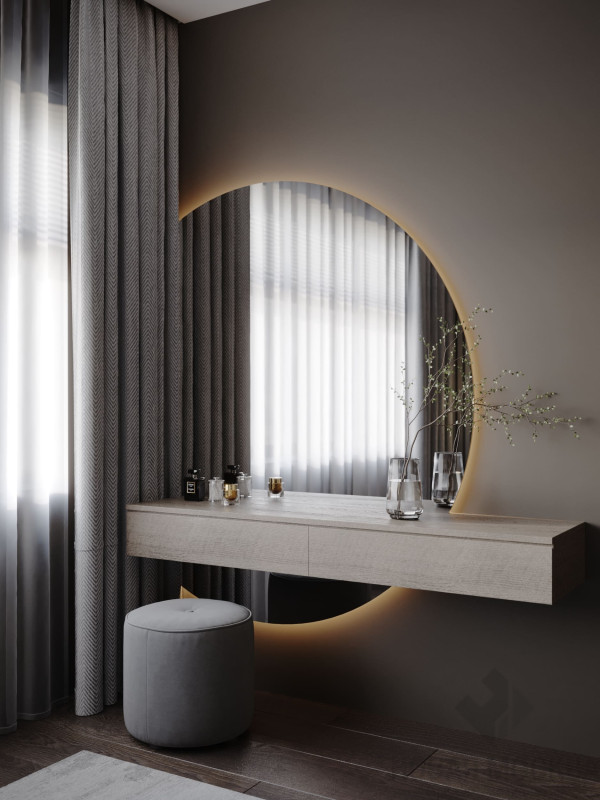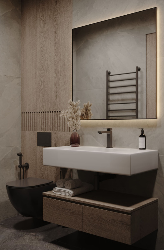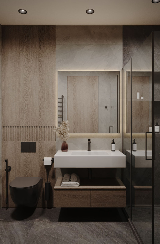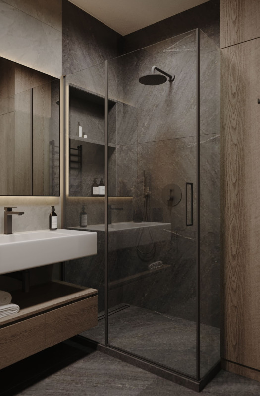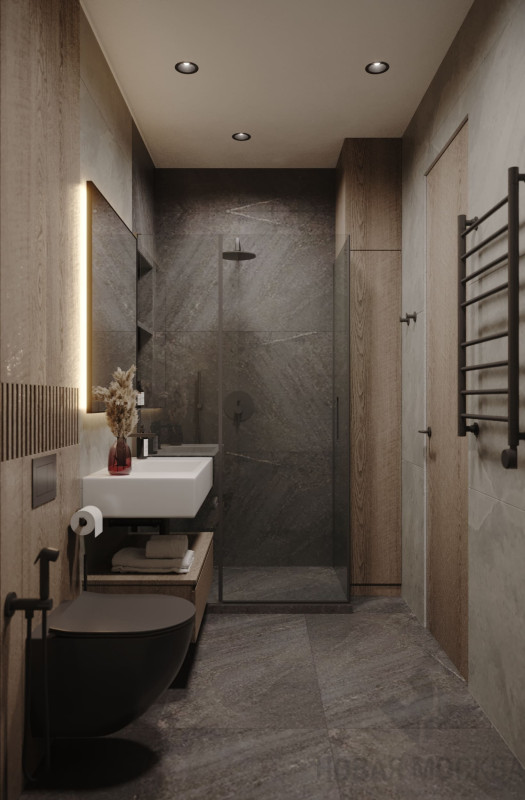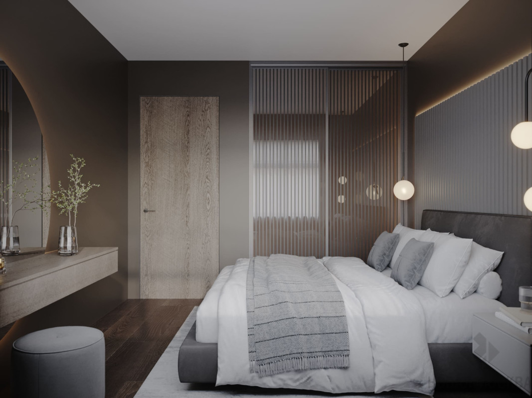 Цветовой основой интерьера стали серые и коричневые оттенки. Сдержанная гамма гармонично сочетается с брутальными деталями: стены отделаны декоративной штукатуркой под бетон, во входной зоне запланировано панно из каменного шпона. При этом квартира не выглядит мрачной: дизайнеру удалось выдержать баланс светлых и темных, холодных и теплых оттенков. Четкие линии сочетаются с плавными формами мебели и мягкостью текстиля, к фактурным элементам отделки и декора хочется прикасаться. Деревянные поверхности и акцентная подсветка создают атмосферу камерности и уюта.