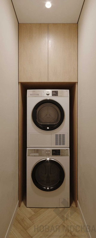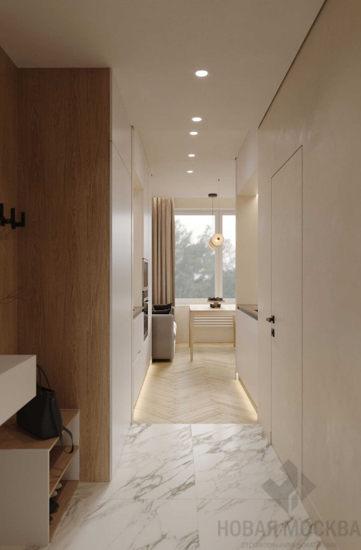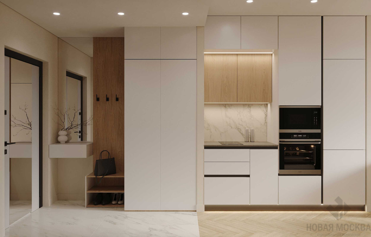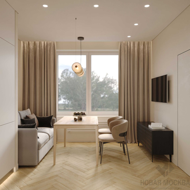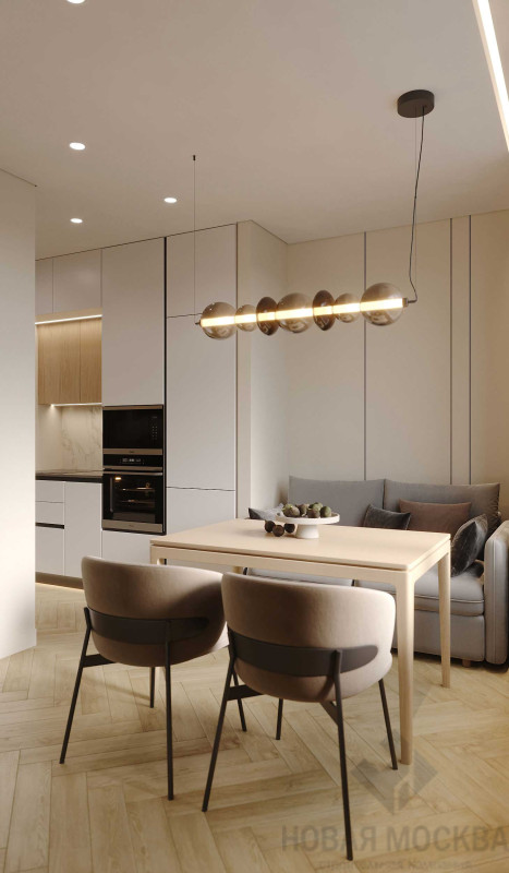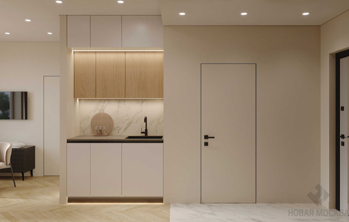 Интерьер выполнен в мягких бежевых оттенках, которые понравятся большинству потенциальных покупателей. Нейтральную палитру гармонично дополняют поверхности с фактурой дерева и светлый текстиль. Раскладка напольного покрытия «елочкой» и комбинация крашеных стен с декоративными панелями делают пространство динамичным несмотря на спокойную гамму. Кухонный гарнитур и системы хранения встроены в ниши, гладкие фасады в цвет стен выглядят легко и не перегружают обстановку.