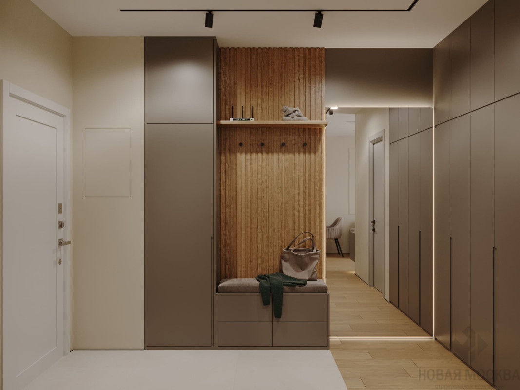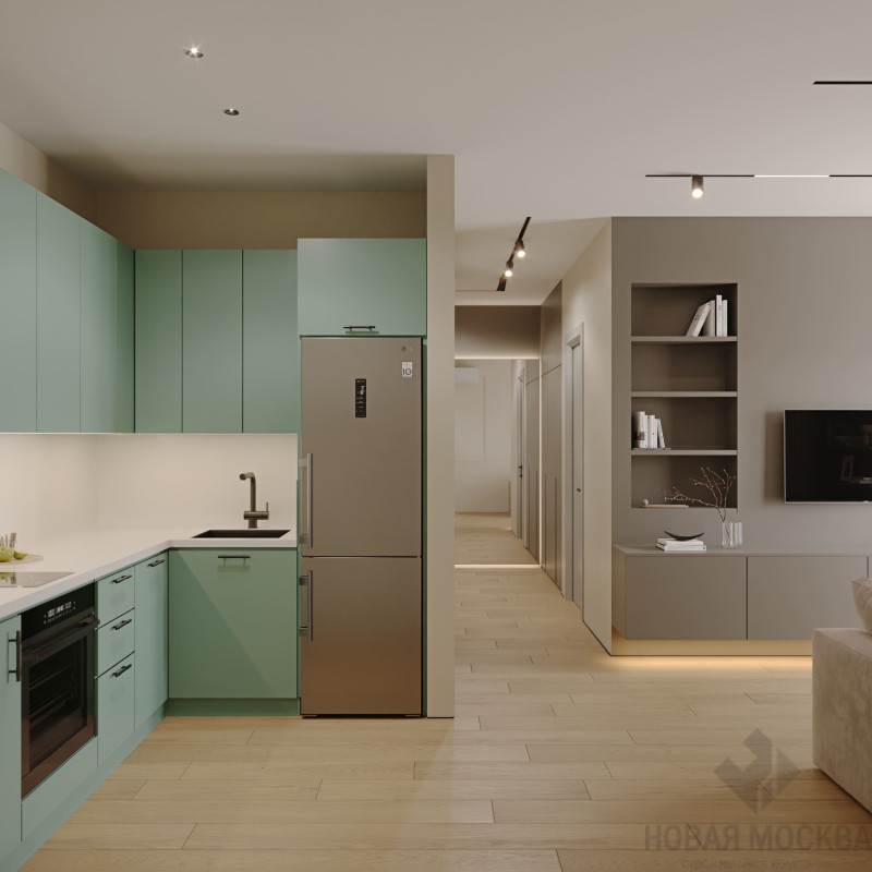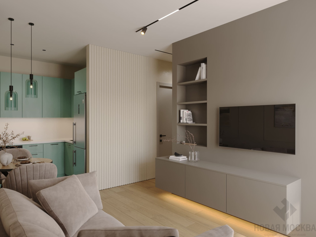 Интерьер выполнен в мягких оттенках бежевого и серого. Нейтральную палитру гармонично дополняют поверхности с фактурой светлого дерева, мебель и отделка цвета какао и нежно-бирюзовая зона кухни. Деликатные рамки молдингов, рифленые стеновые панели и фасады мебели избавляют спокойный интерьер от монотонности и задают визуальный ритм.