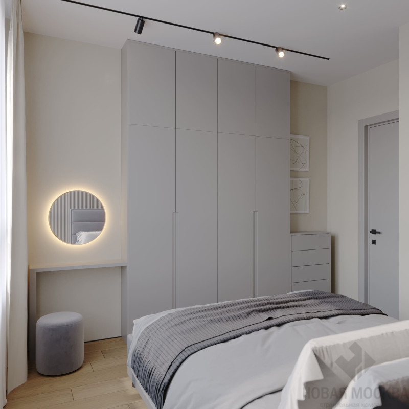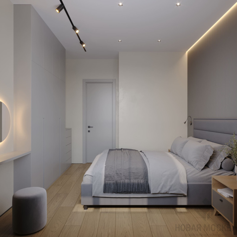 Дизайнер учел скромные габариты жилья и сделал систему освещения подчеркнуто лаконичной. Графичные линии трекинговых светильников не перегружают обстановку и зонируют пространство, скрытая подсветка зеркал, изголовья кровати и ТВ-зоны создает ощущение легкости и тепла.