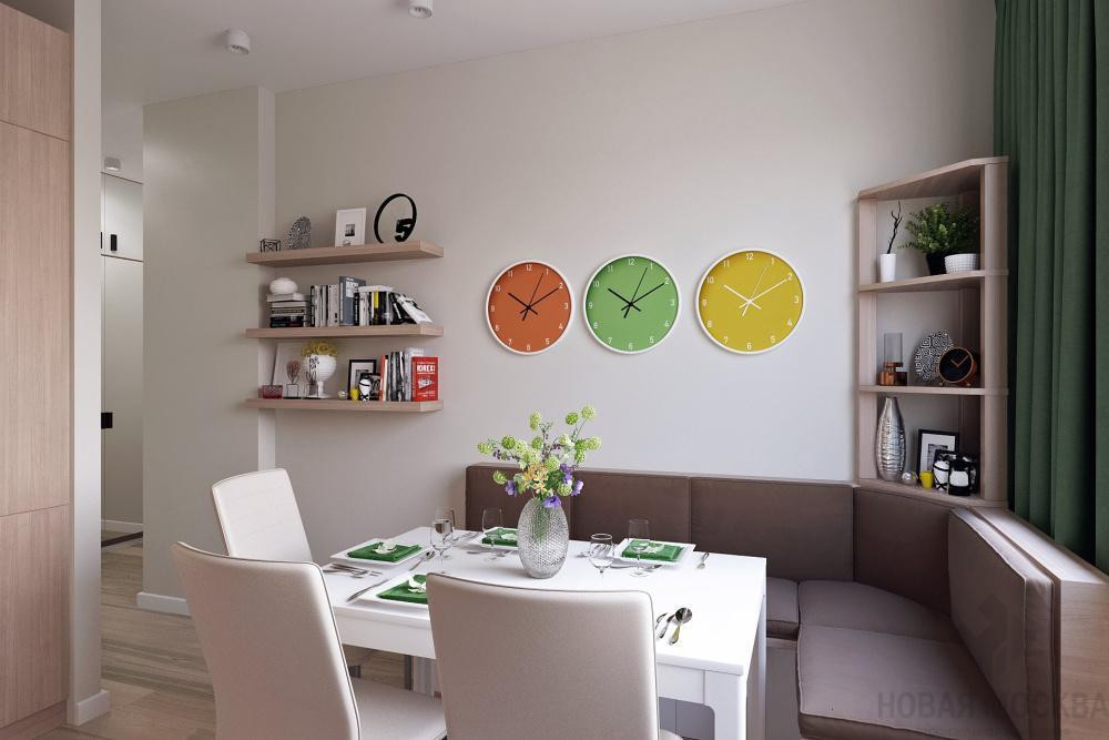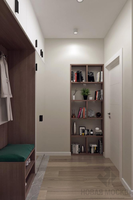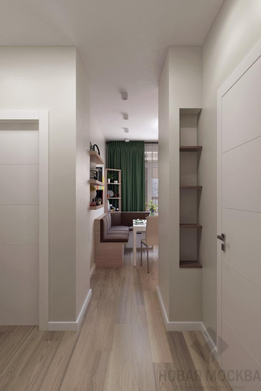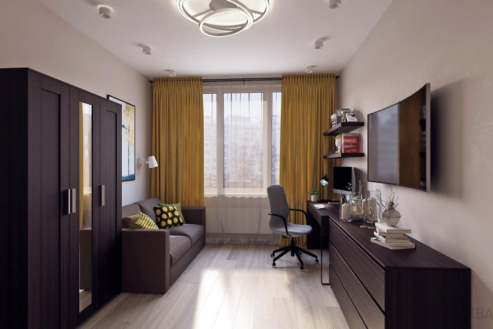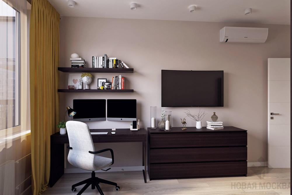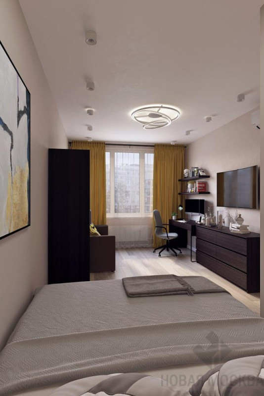 Создать интерьер, отвечающий потребностям молодого неженатого мужчины. В жилой комнате организовать полноценное спальное место, рабочую зону, зону отдыха и просмотра ТВ. В кухне-столовой разместить обеденную группу, барную стойку не использовать. Для оформления интерьера выбрать приглушенные тона.