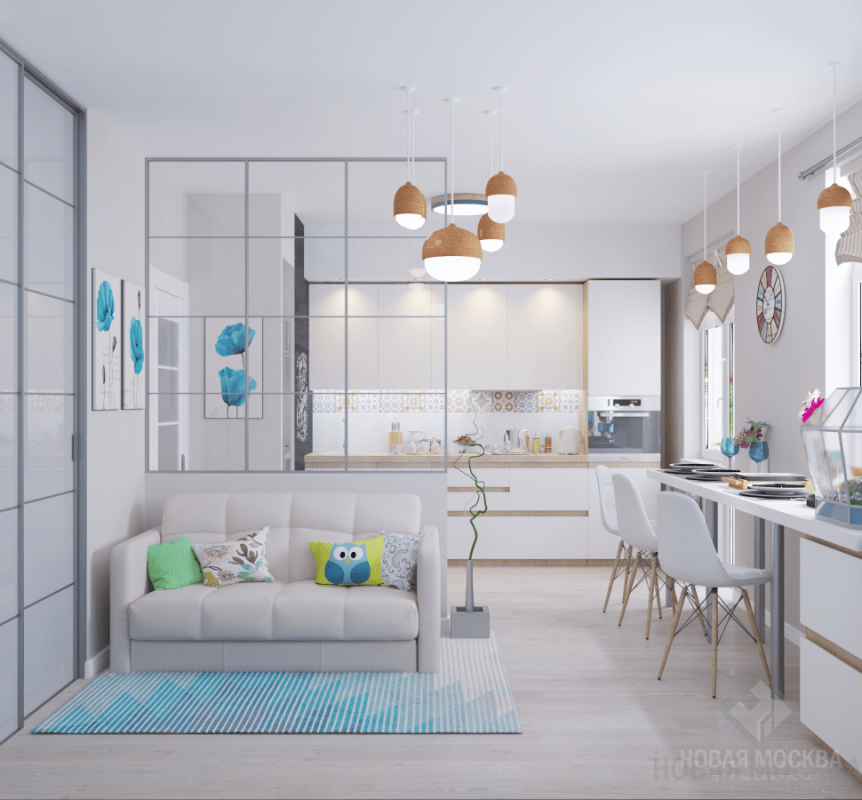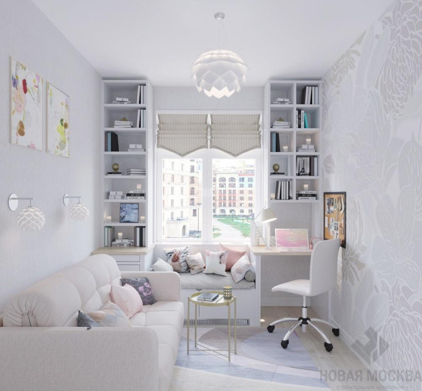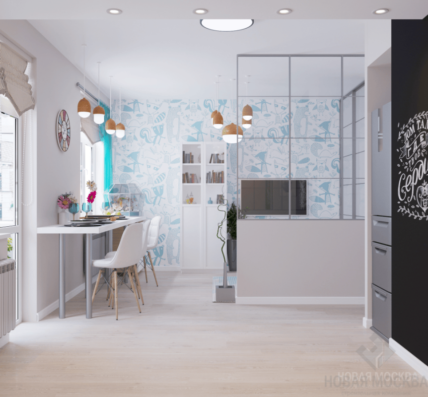 Создать интерьер для комфортного проживания юной леди и ее мамы. Кухню-гостиную поделить на жилую и рабочую часть. Организовать обеденную зону. Предусмотреть достаточно мест для хранения. Подобрать отделку в светлых тонах без ярких кричащих акцентов.