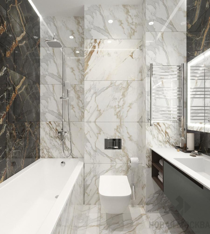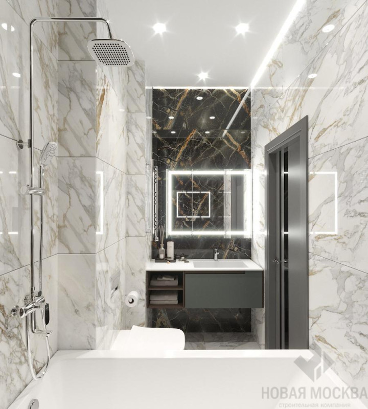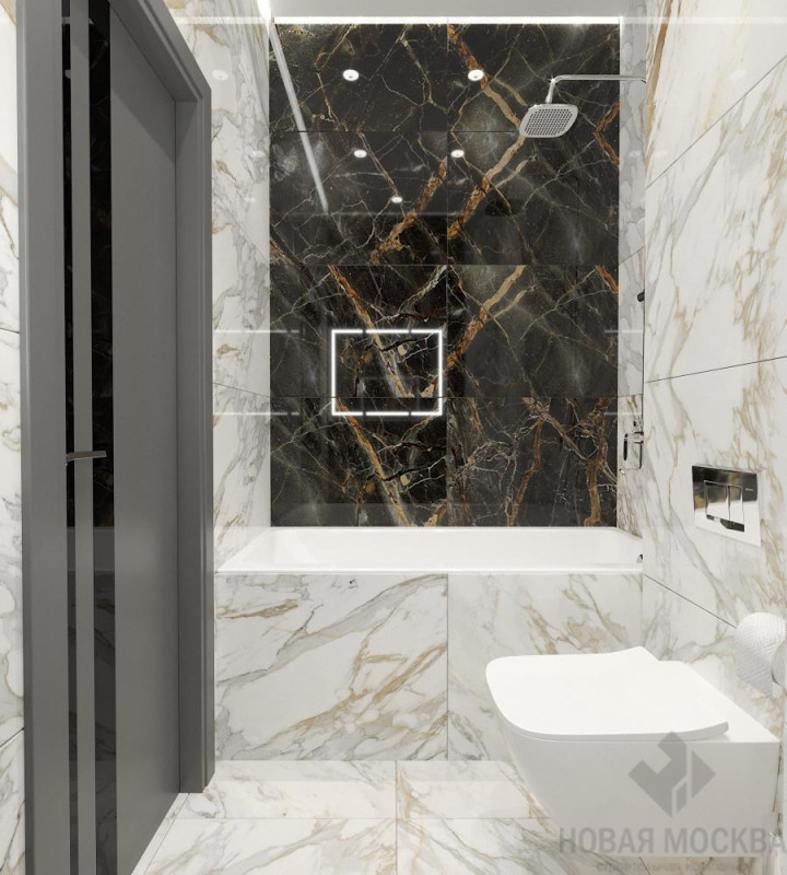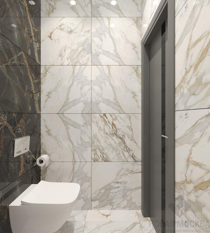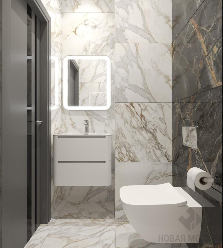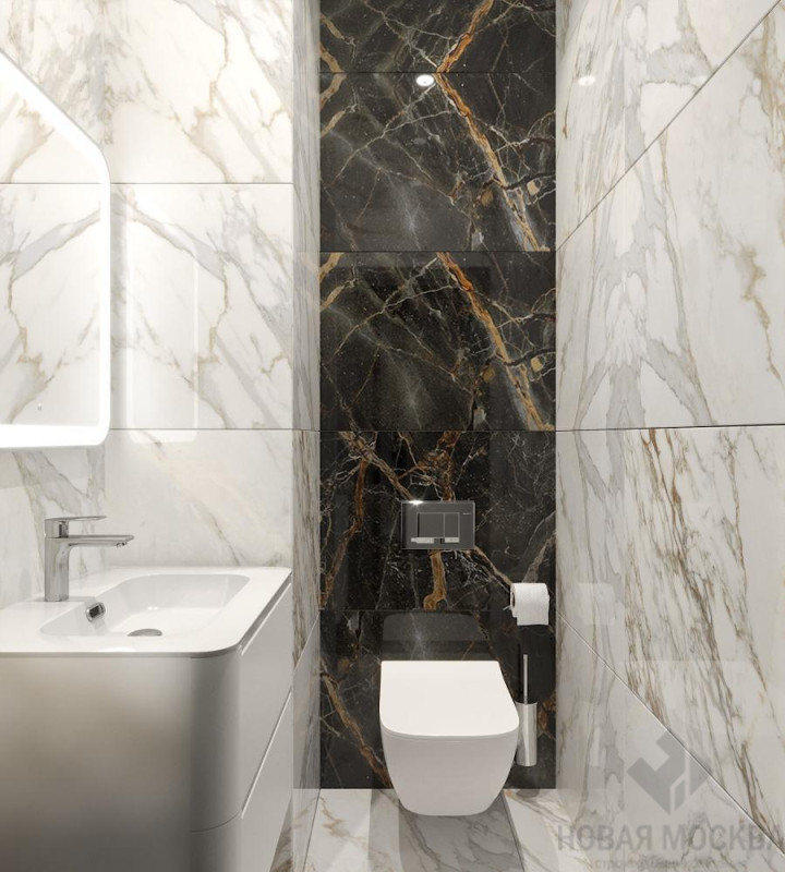 Одним из пожеланий заказчика был второй санузел. Его удалось разместить у входа в квартиру, изменив форму ванной комнаты, предусмотренной застройщиком. Рядом в нише за дверцами предусмотрено место для стиральной машины, хранения бытовой химии и хозяйственного инвентаря.