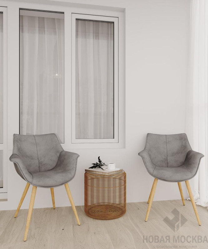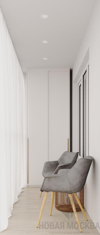 Планировку от застройщика менять не стали — она полностью устраивала заказчиков. На площади около 66 кв. м. расположились кухня-гостиная, автономные спальня и кабинет, раздельные туалет и ванная. На утепленной лоджии разместили лаунж-зону и шкаф для хранения бытовых мелочей.
