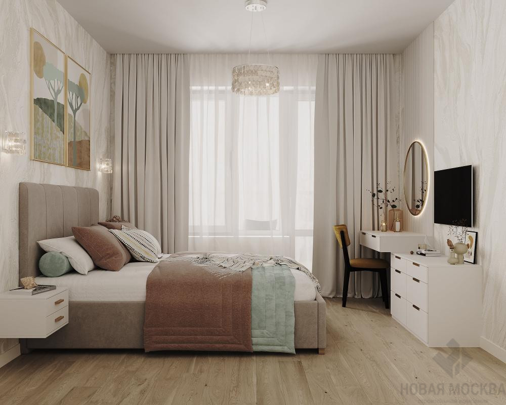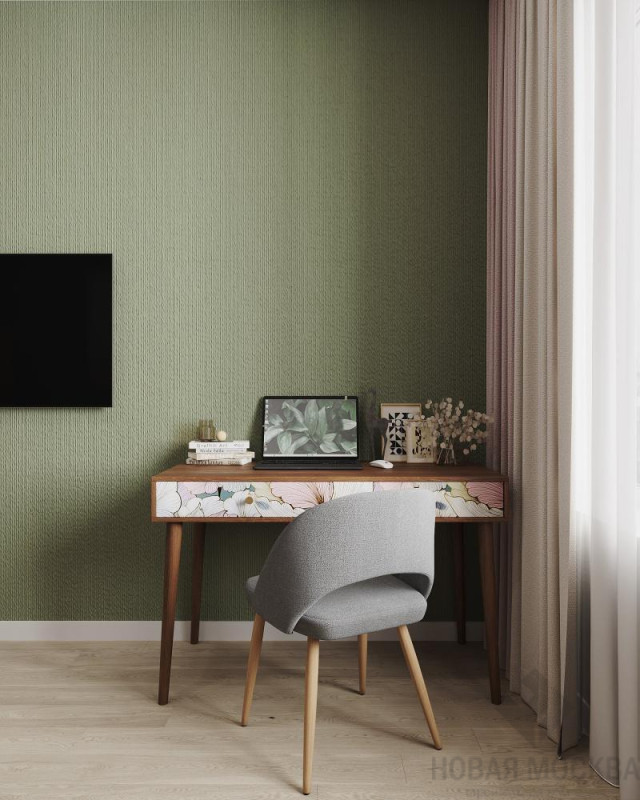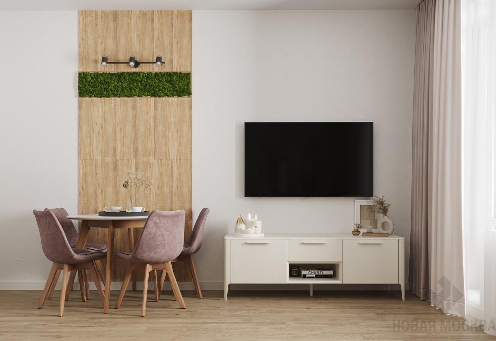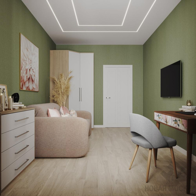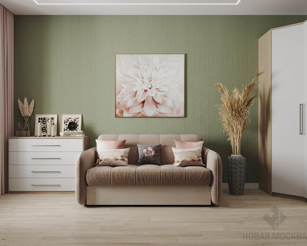 Для жилых комнат и кухни-гостиной выбраны комфортные и приветливые оттенки бежевого, розового и зеленого. Стены оклеены обоями с выраженной фактурой или деликатными принтами в пастельных цветах. Теплое «дерево» кварцвинилового напольного покрытия и светлая мебель также способствуют общему впечатлению легкости и уюта.