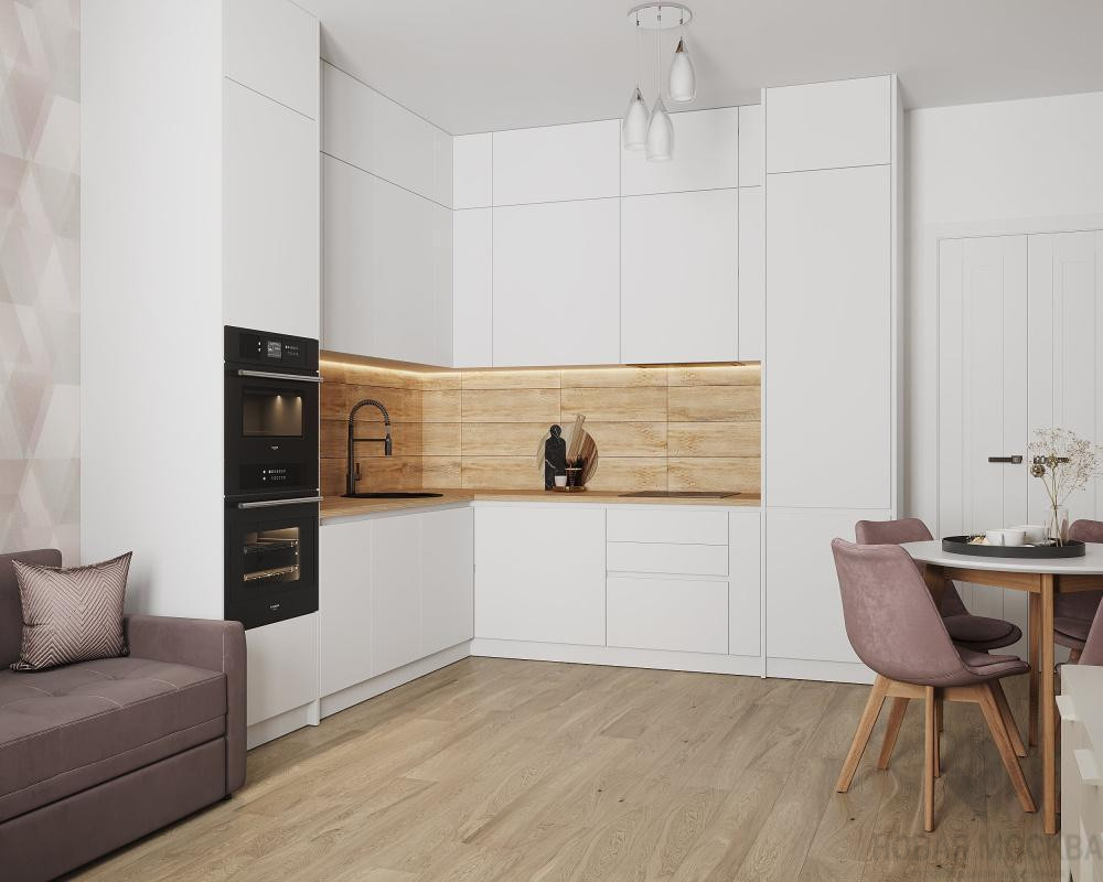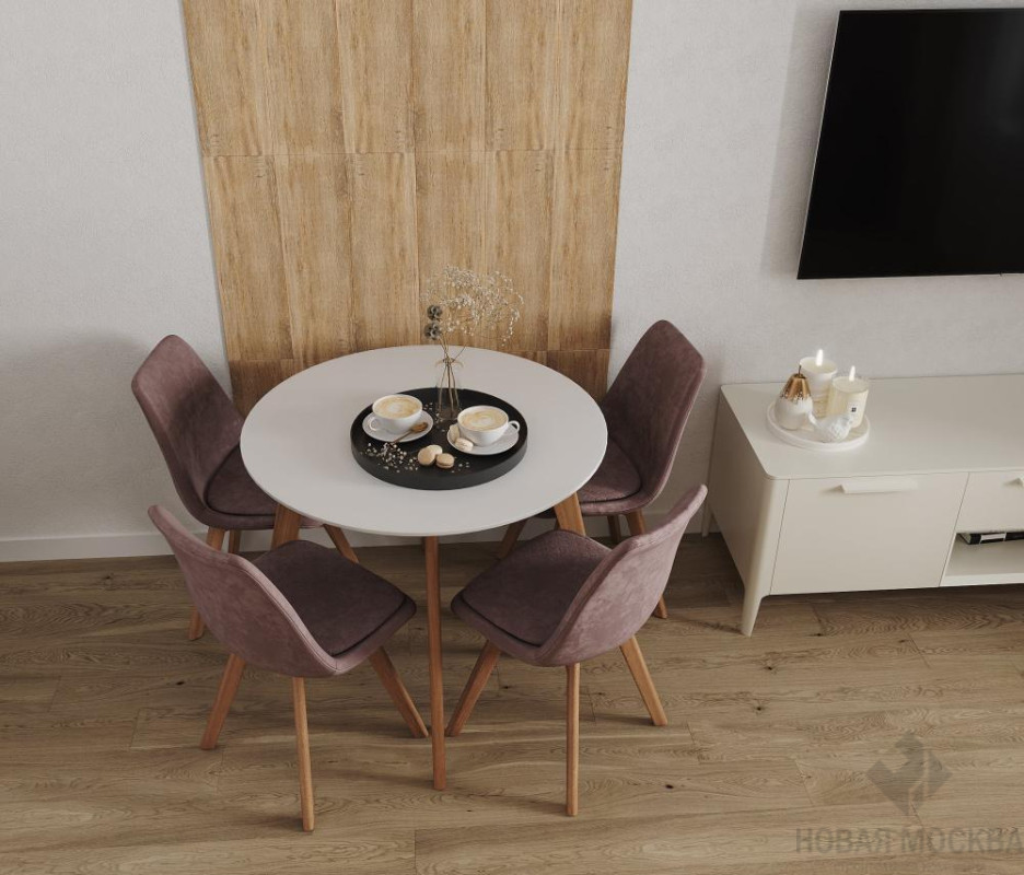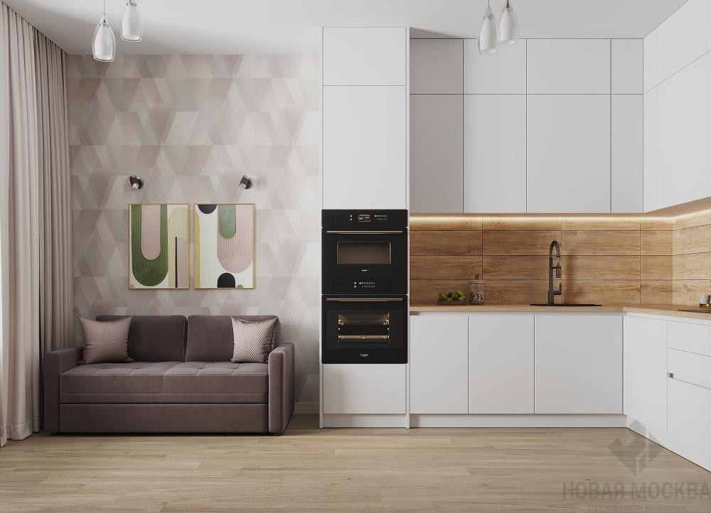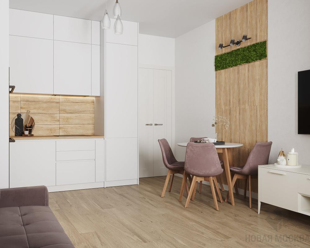Для жилых комнат и кухни-гостиной выбраны комфортные и приветливые оттенки бежевого, розового и зеленого. Стены оклеены обоями с выраженной фактурой или деликатными принтами в пастельных цветах. Теплое «дерево» кварцвинилового напольного покрытия и светлая мебель также способствуют общему впечатлению легкости и уюта.