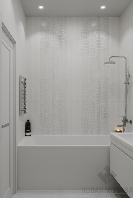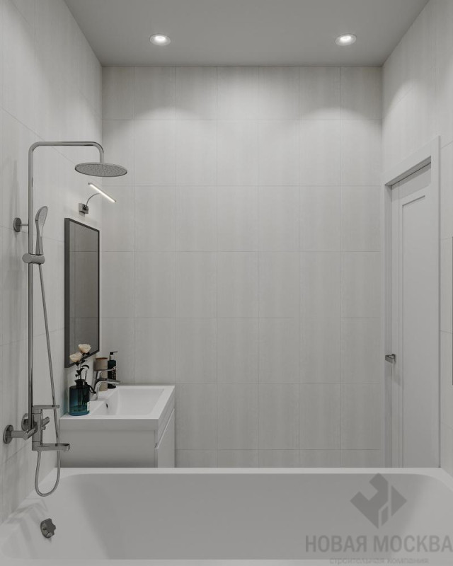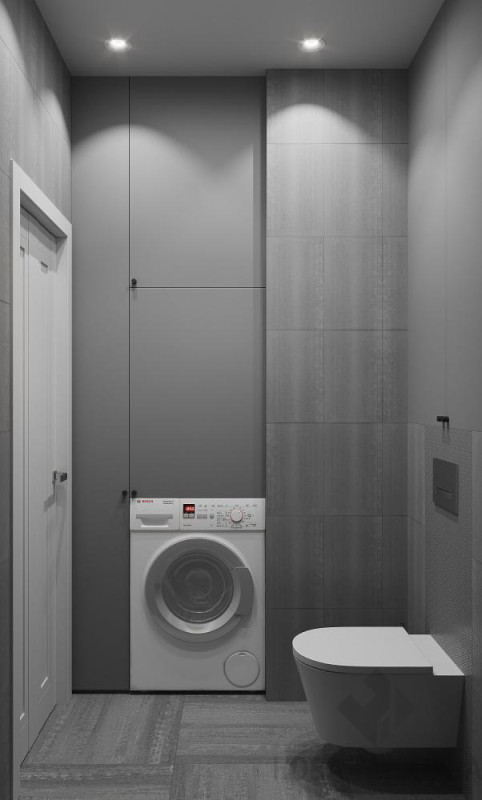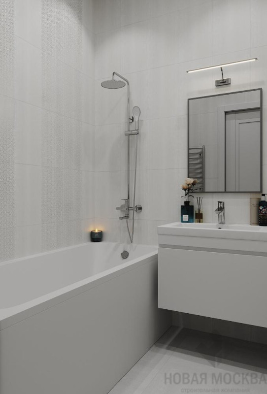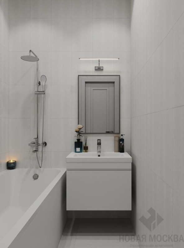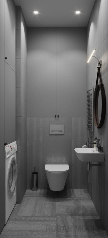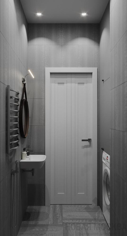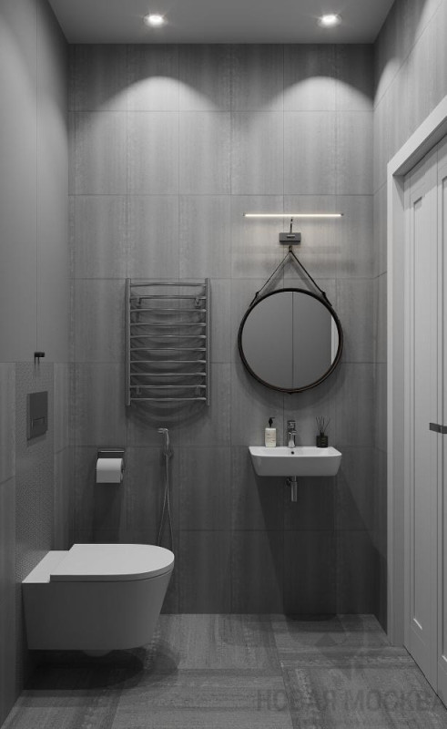 В прихожей и санузлах царит лаконичный дизайн и минималистичная цветовая гамма. Обстановка не перегружена деталями, здесь несложно поддерживать порядок благодаря системам скрытого хранения. Зеркало в ванной помимо своей основной роли выполняет маскировочную функцию — за ним спрятали приборы учета воды. Подвесная сантехника облегчает уборку.