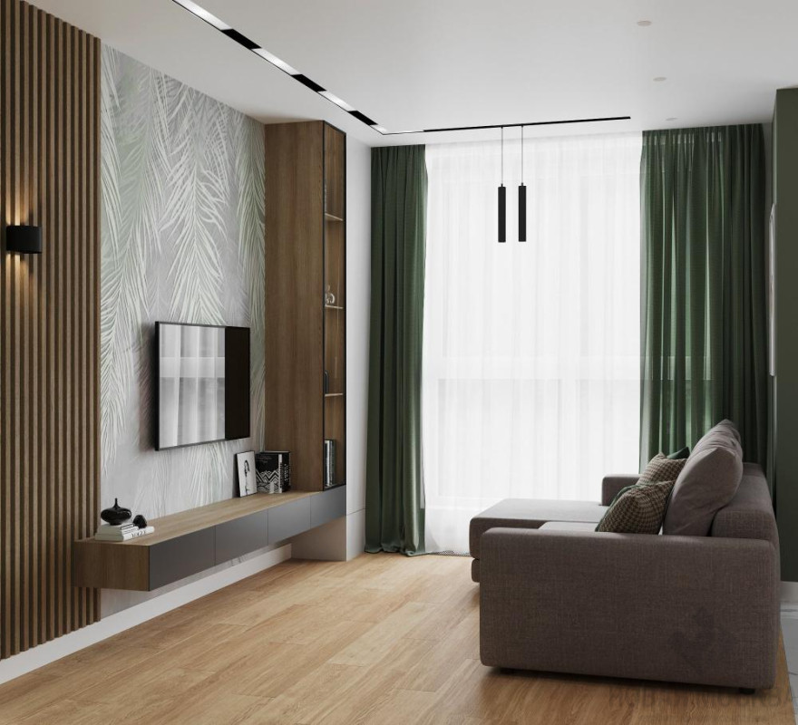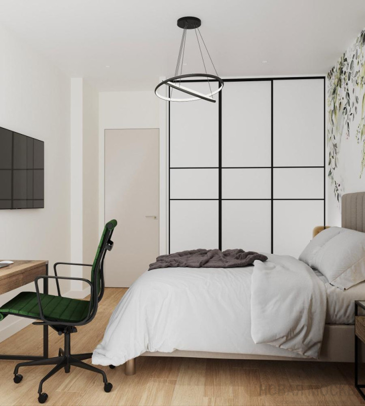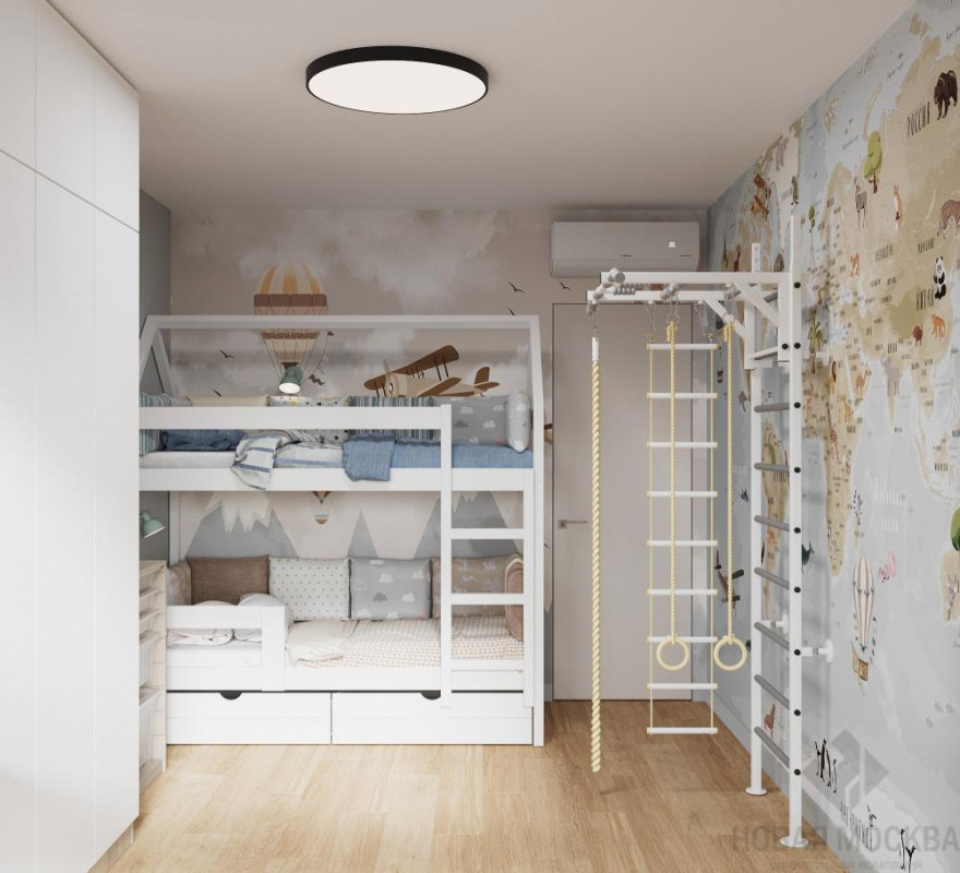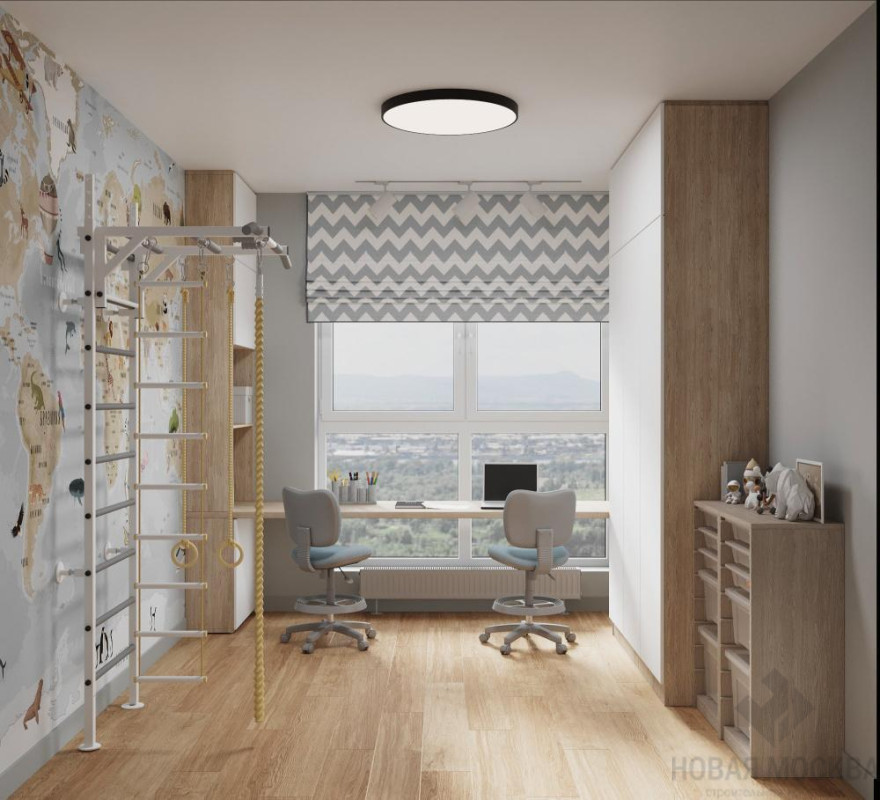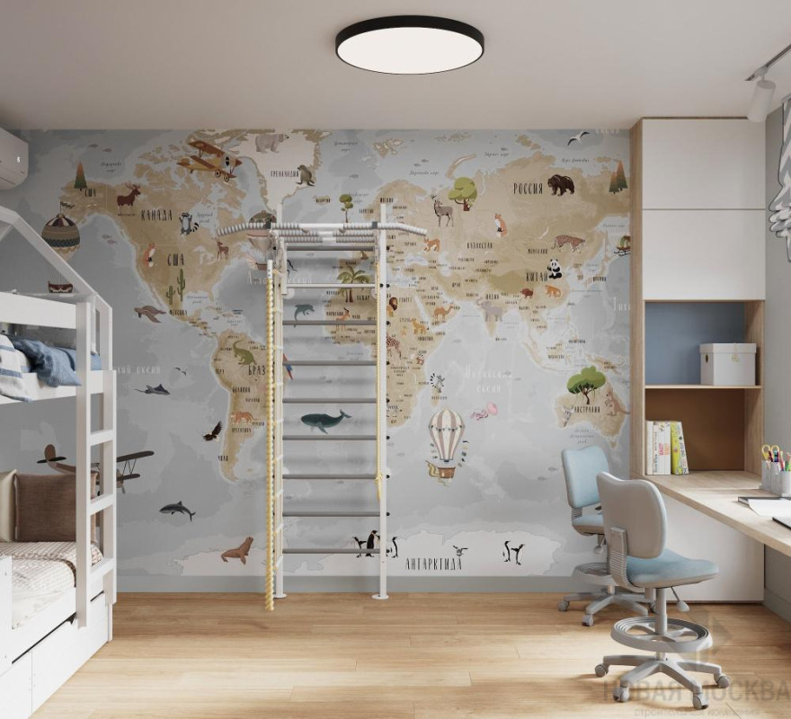 Лаконичную стилистику интерьера смягчает натуральная гамма и акценты в эко-стиле. Дымчатый серый, приглушенный оливковый, растительные принты в отделке гармонично сочетаются с деревянными поверхностями мебели, пола, декоративных панелей. В продолжение природной тематики для детской комнаты выбрали фотообои с географической картой.