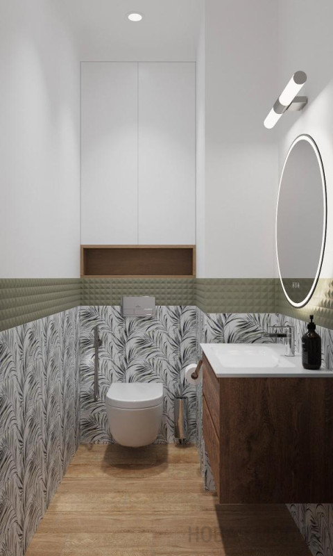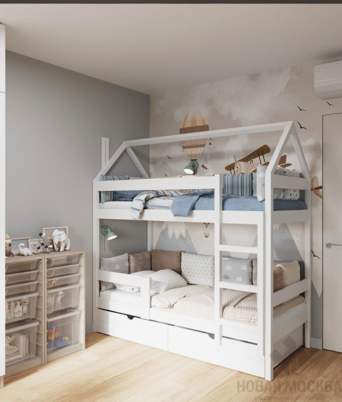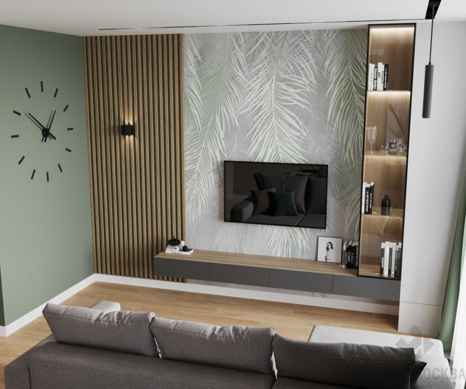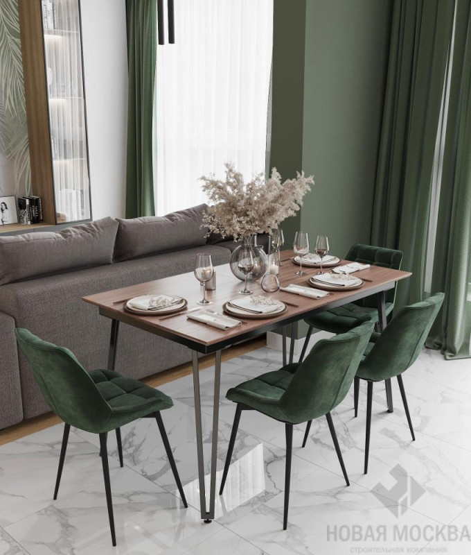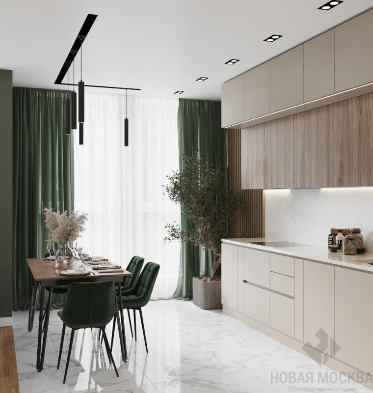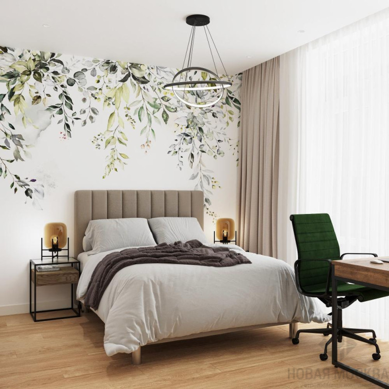 Лаконичную стилистику интерьера смягчает натуральная гамма и акценты в эко-стиле. Дымчатый серый, приглушенный оливковый, растительные принты в отделке гармонично сочетаются с деревянными поверхностями мебели, пола, декоративных панелей. В продолжение природной тематики для детской комнаты выбрали фотообои с географической картой.