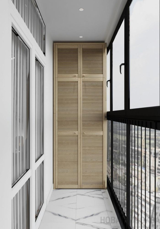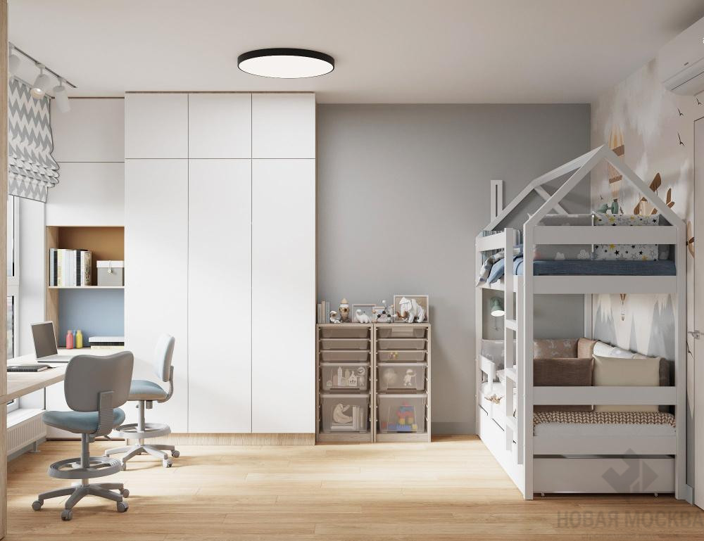 Заказчики получили просторную детскую для двоих сыновей, спальню для родителей и кухню-гостиную. Максимально задействовали зоны хранения — удобный высокий шкаф есть даже на лоджии.