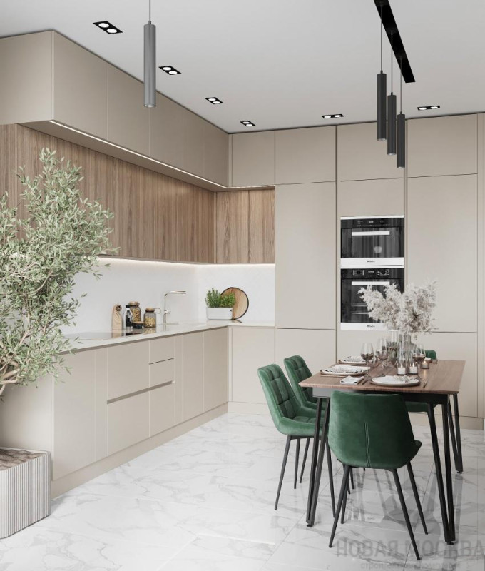 Внушительный угловой диван отделяет кухню от гостиной, оставляя место для обеденного стола. Это одновременно сохраняет объем помещения и зонирует пространство. Продуманное распределение функций интерьера поддерживают сценарии освещения: потолочные споты, встроенные линейные светильники, бра, оригинальная люстра в детской комнате и скрытая подсветка на кухне.