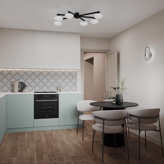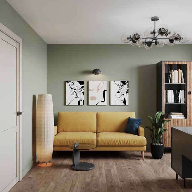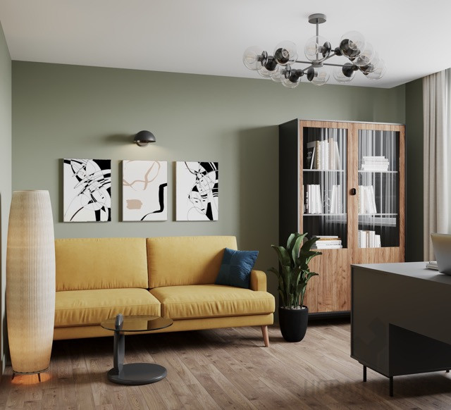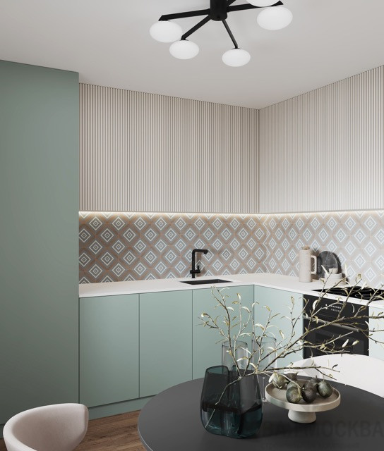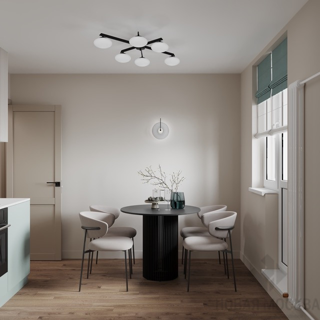 Палитру интерьера формируют сложные пастельные оттенки: бежевый разной насыщенности в прихожей, кухне и гостиной, зеленый в кабинете и серый в спальне. Для заказчика было важно присутствие цвета в каждом помещении — приглушенные базовые тона дополнили яркой мягкой мебелью, подобрали акцентный декор и текстиль.