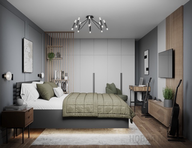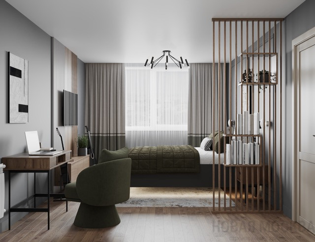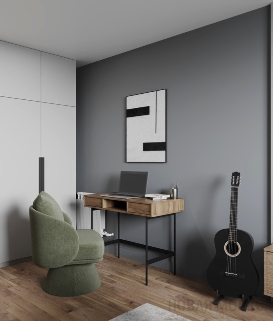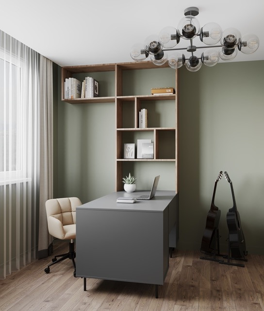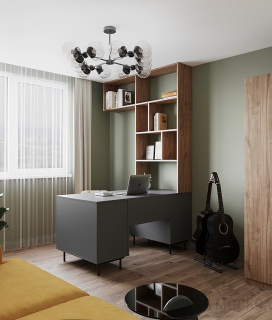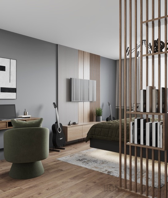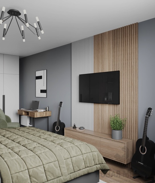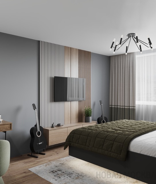 Владелец жилья увлекается музыкой, занимается йогой и любит комнатные растения. Дизайнер учел все пожелания клиента: коллекцию гитар разместили в кабинете, коврик для принятия асан можно расстелить в спальне, а кашпо с зелеными «питомцами» украшают почти каждую комнату квартиры.