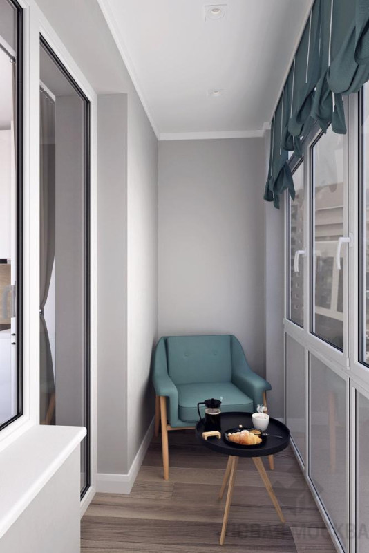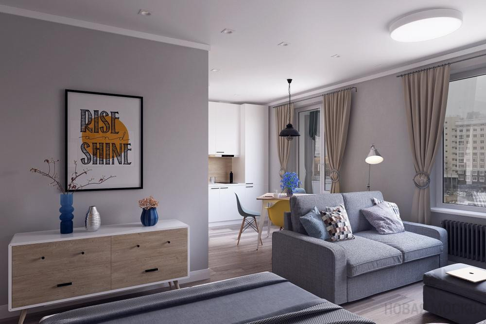 Создать просторный интерьер в спокойных тонах. Объединить кухню и гостиную, организовать в полученном пространстве четыре зоны: кухню, столовую, гостиную и спальню. В зоне сна предусмотреть полноценную двуспальную кровать. На балконе устроить лаунж. В отделке использовать краску, ламинат, керамическую плитку.