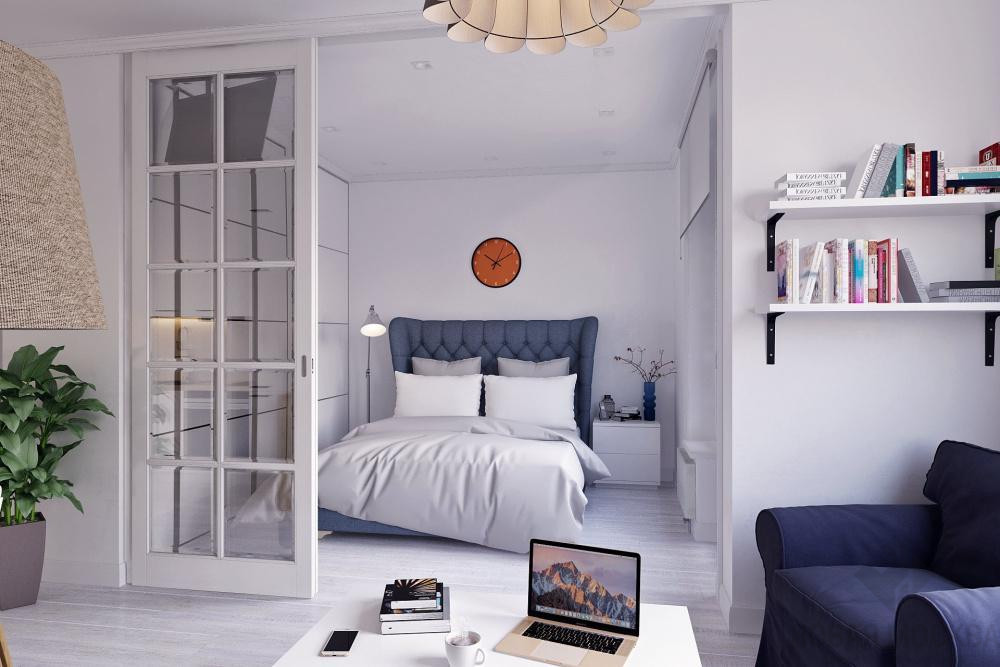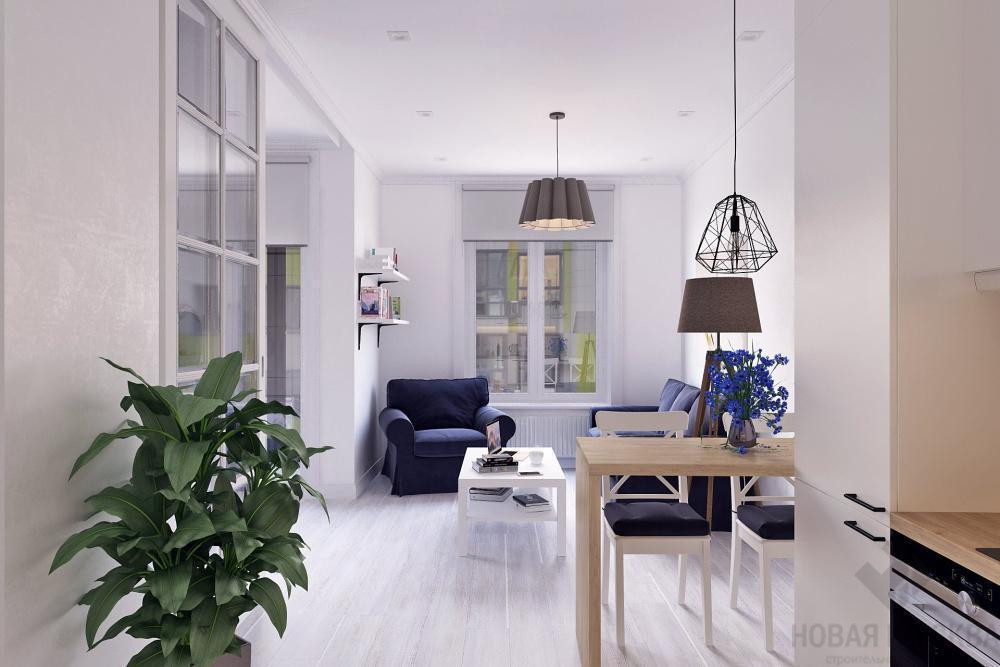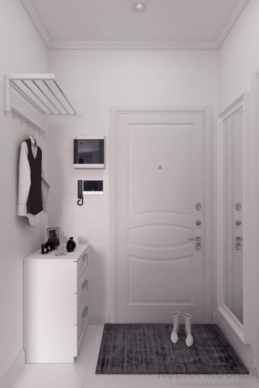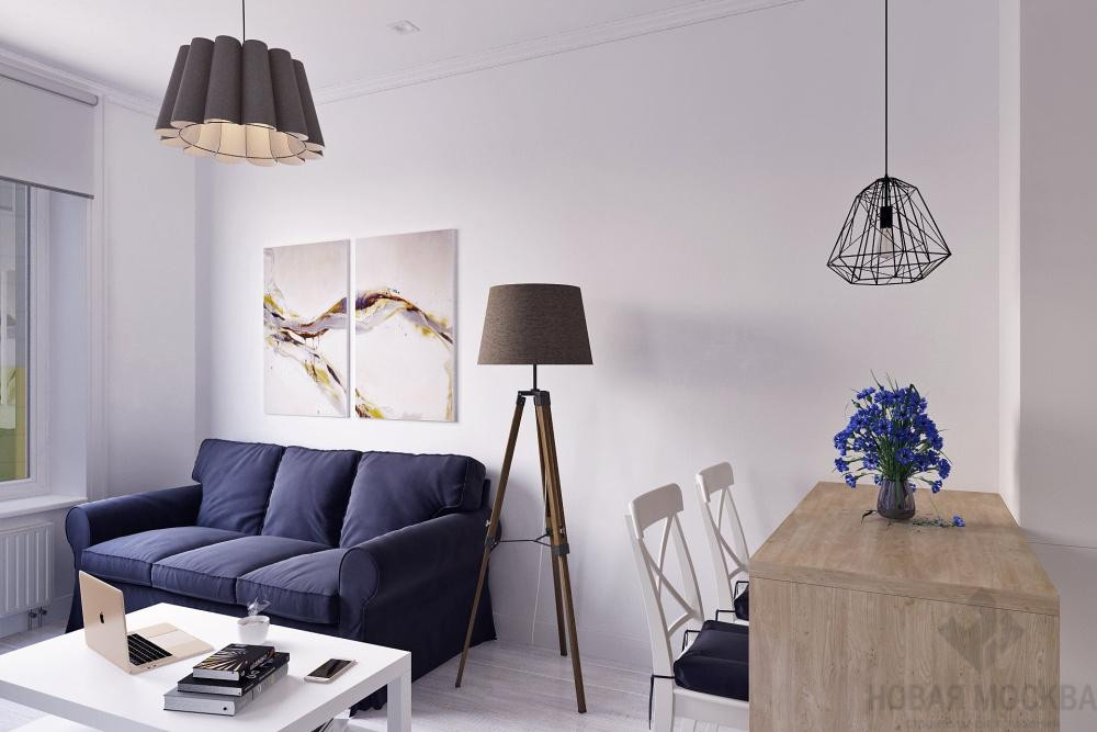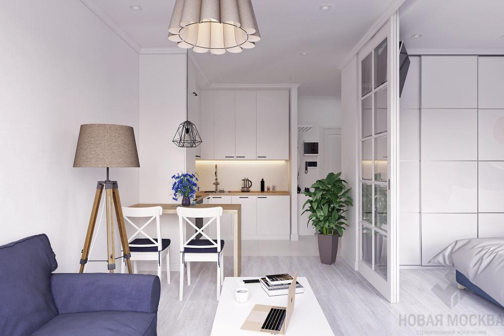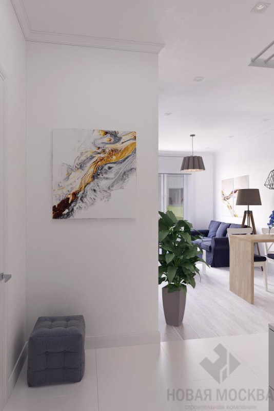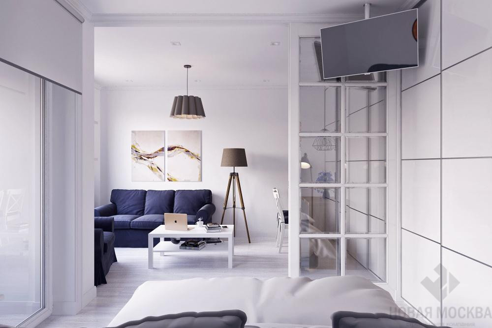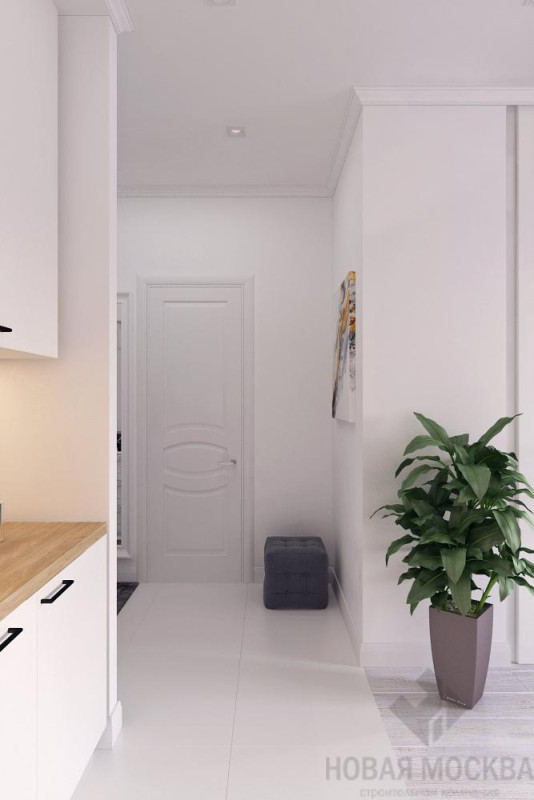 Создать уютный лаконичный интерьер в белом цвете. В квартире со свободной планировкой организовать общественную часть — прихожую, кухню-гостиную, и приватную зону. Спальню отгородить от остальной части квартиры при помощи раздвижных дверей. Лоджию, примыкающую к спальне, утеплить, но не присоединять. В отделке использовать краску, ламинат, керамическую плитку, искусственный камень.