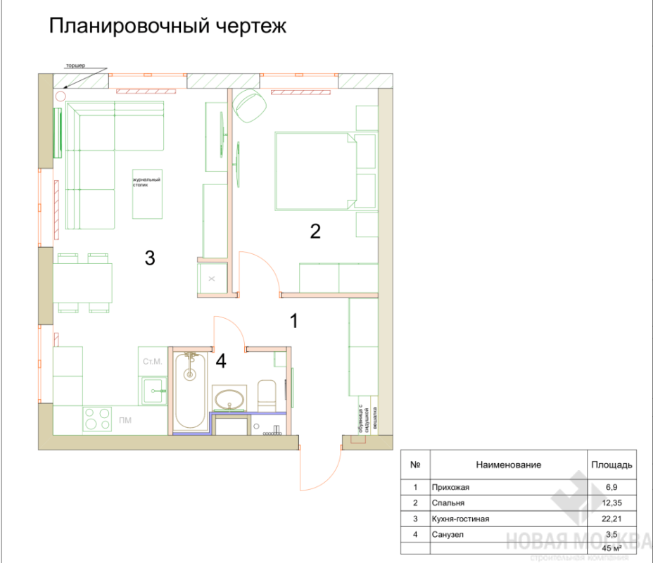 Дизайн-проект 2-комнатной квартиры 45 кв.м по адресу: Москва, посёлок Коммунарка, улица Бачуринская, дом 7, корпус 2