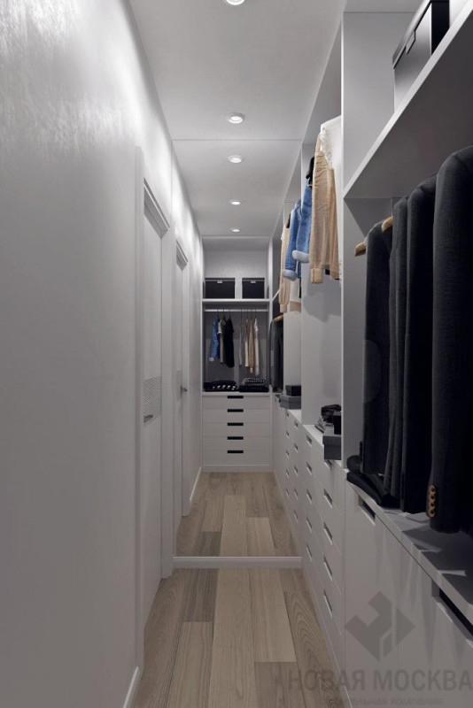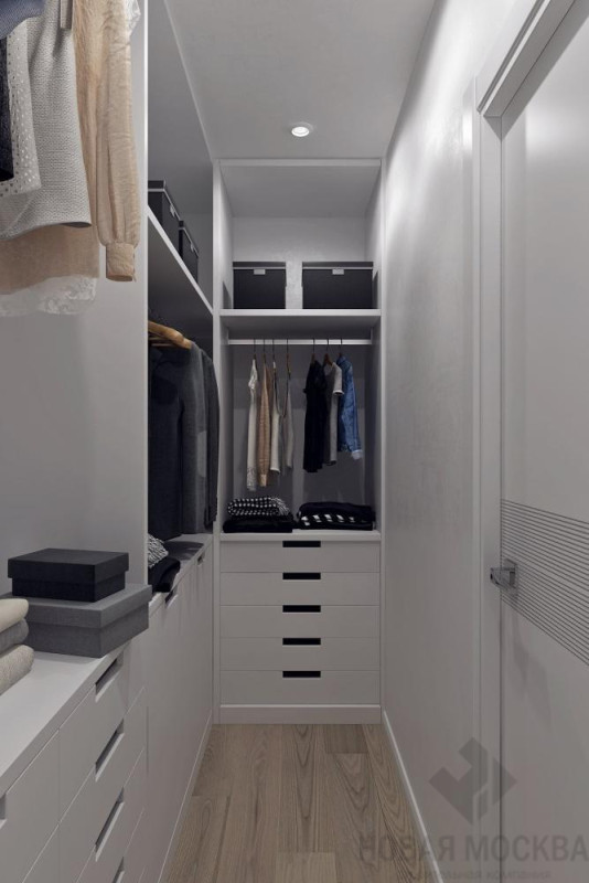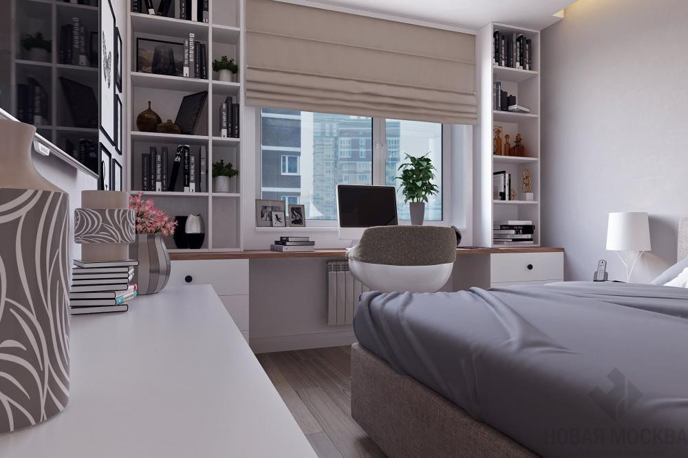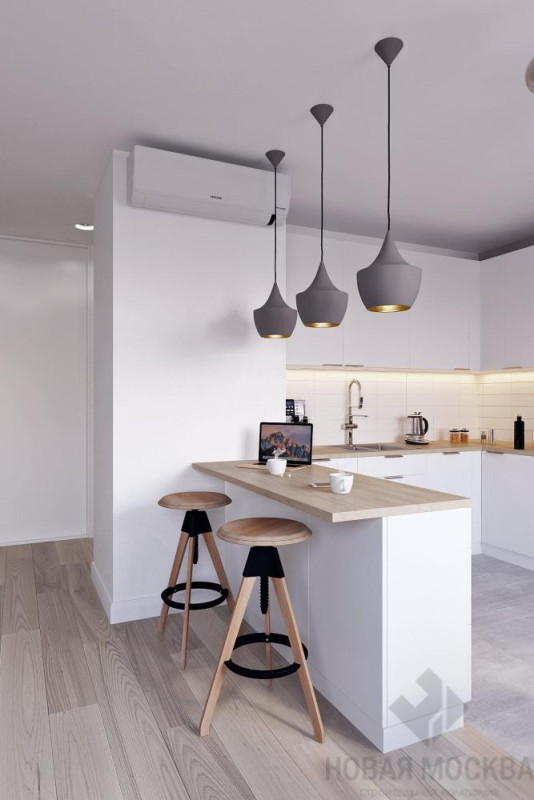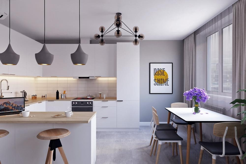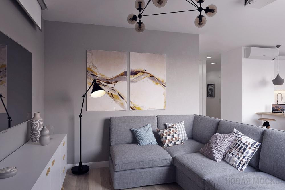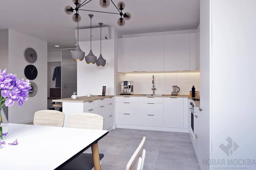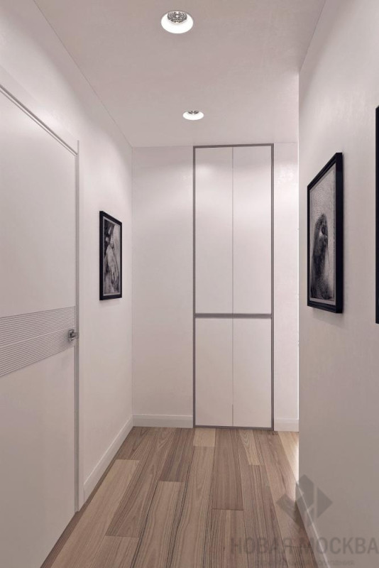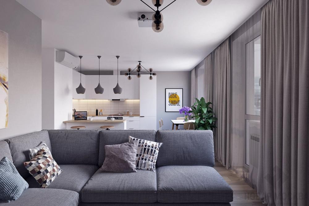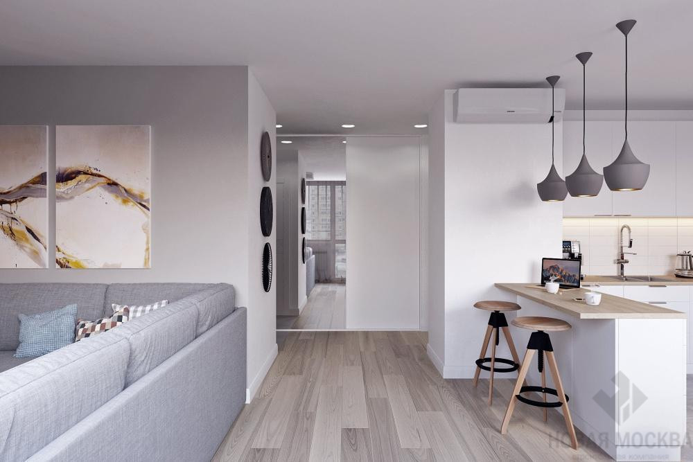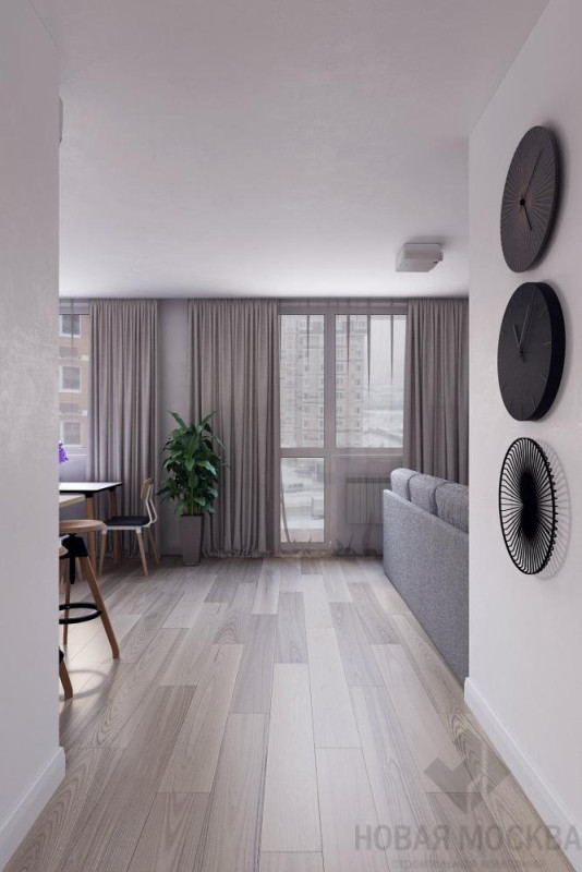 Создать просторный интерьер в спокойных тонах. Для максимального простора объединить кухню и гостиную, организовать в полученном пространстве три зоны: приготовления пищи, столовую и гостиную. Выделить гардеробную и отдельное место для стиральной машины. В изолированной спальне предусмотреть зону кабинета. В отделке использовать краску, ламинат, керамическую плитку.