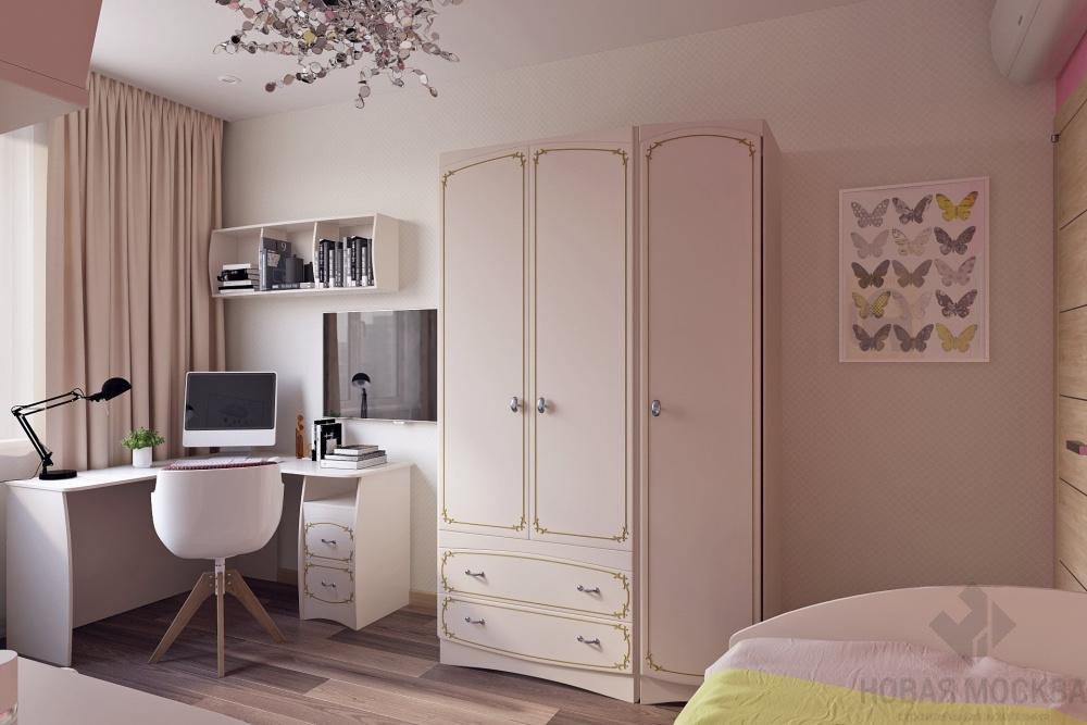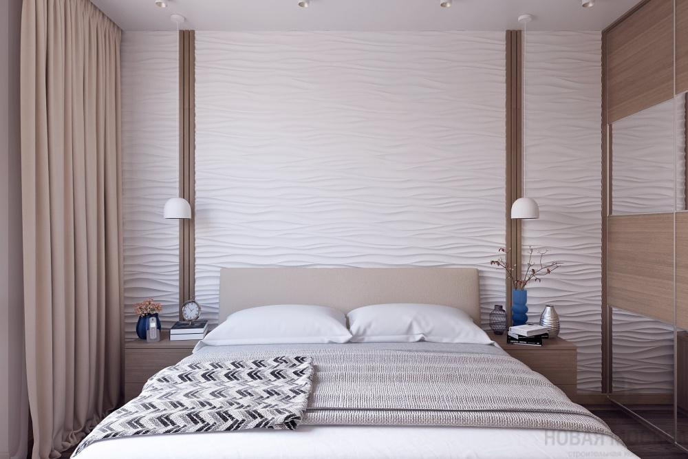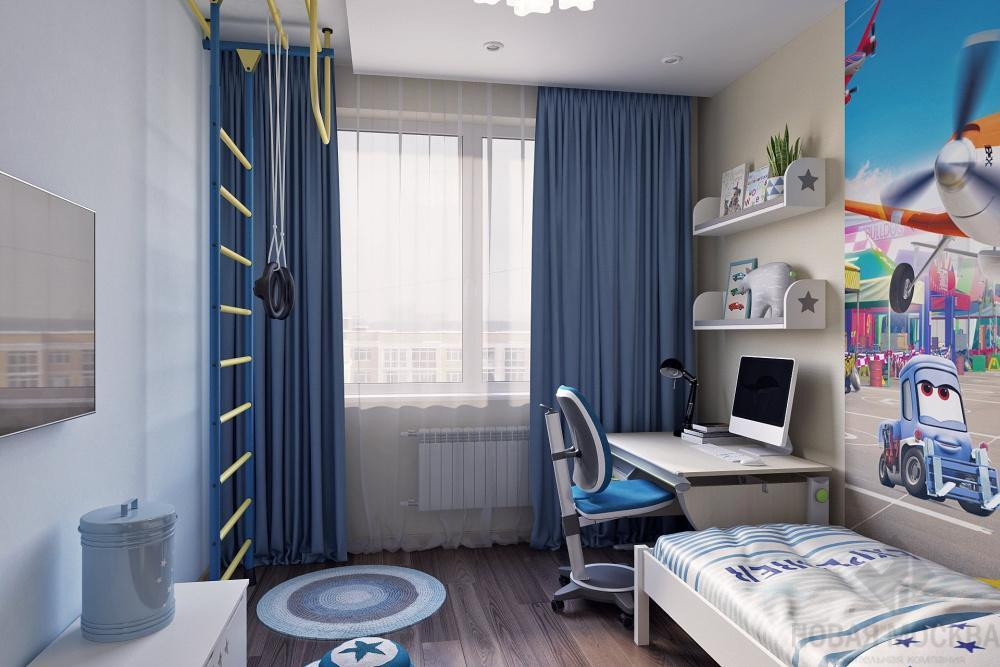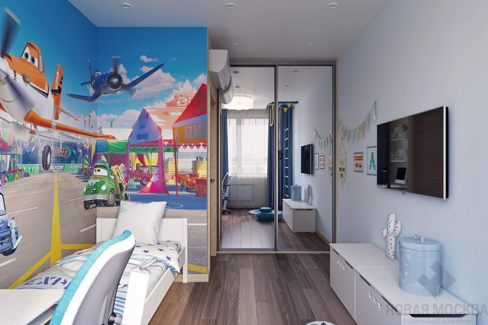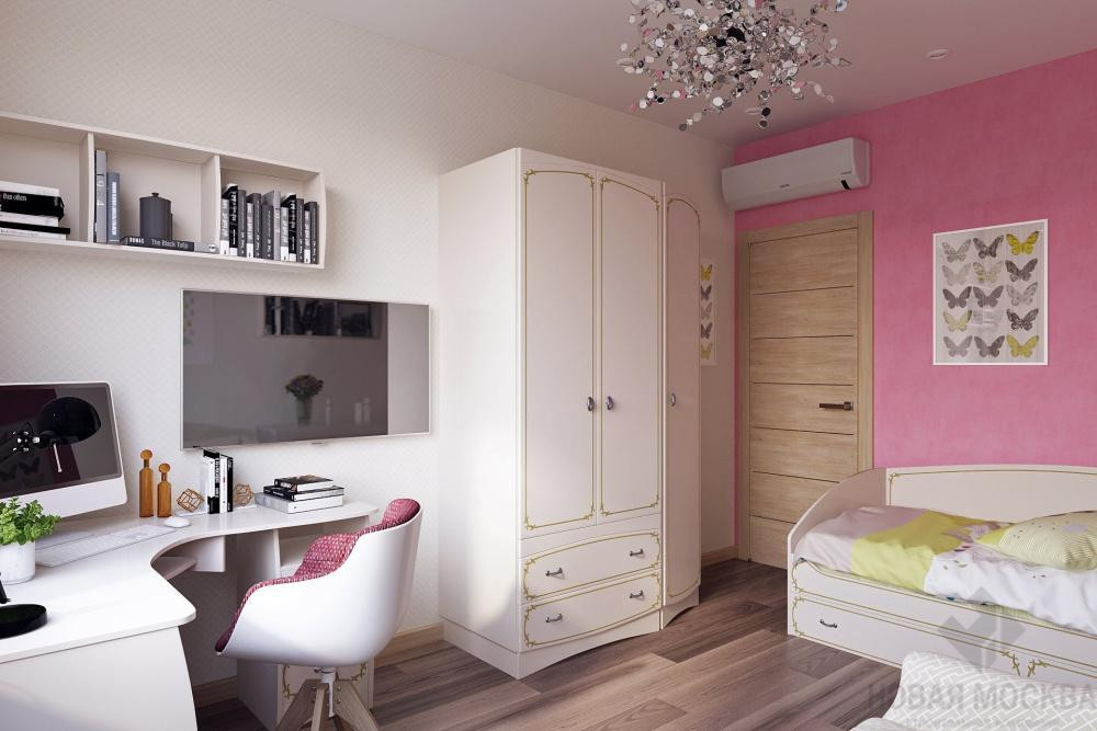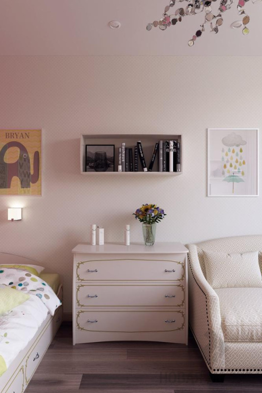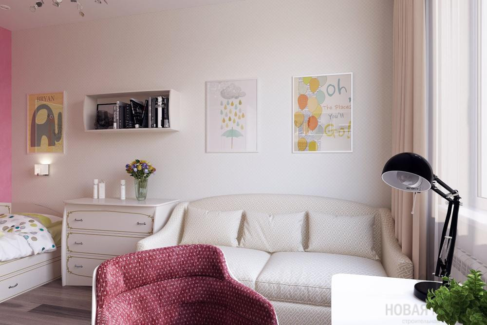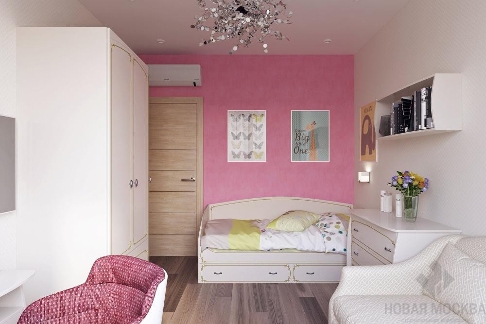 Создать интерьер с тремя приватными комнатами и общественной зоной для комфортного проживания семьи с двумя разнополыми детьми. В качестве стилевой концепции выбрать современное оформление с элементами классики. В отделке использовать обои, краску, гипсовые 3D-панели, ламинат, керамическую плитку.
