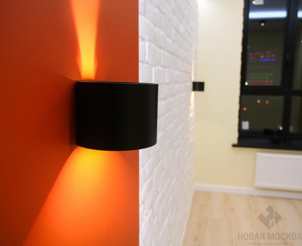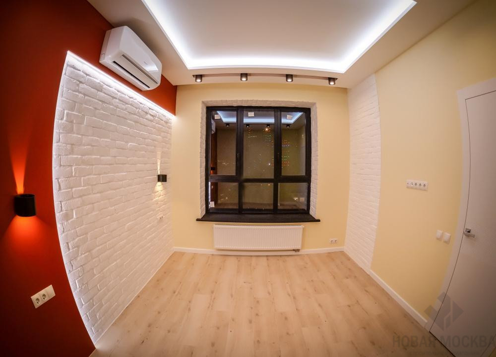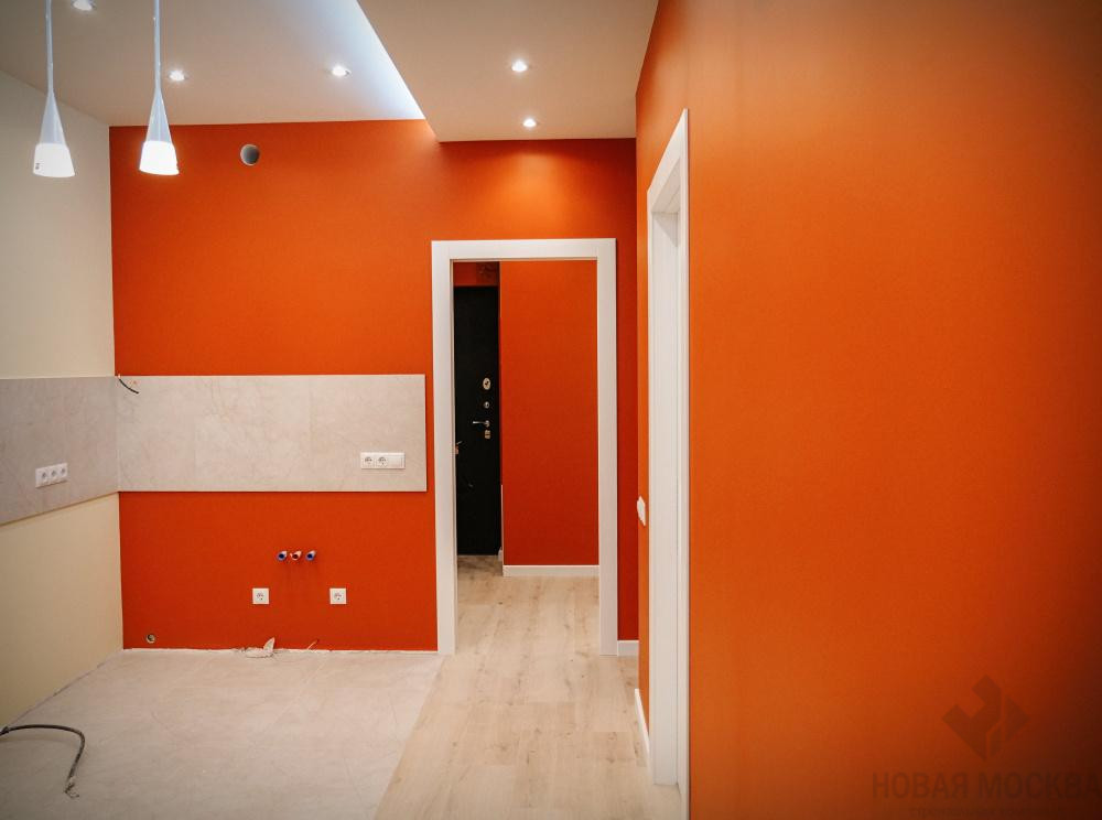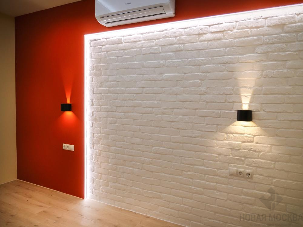 Создать яркий эффектный интерьер согласно дизайн-проекту для проживания молодой пары. Все помещения оставить в своих границах. Стены подготовить под покраску. Сделать комбинированные потолки из гипсокартона и натяжного полотна. Предусмотреть различные сценарии освещения. В отделке использовать краску, керамическую плитку в санузле, декоративный кирпич, на пол уложить ламинат и керамогранит в зоне кухни.