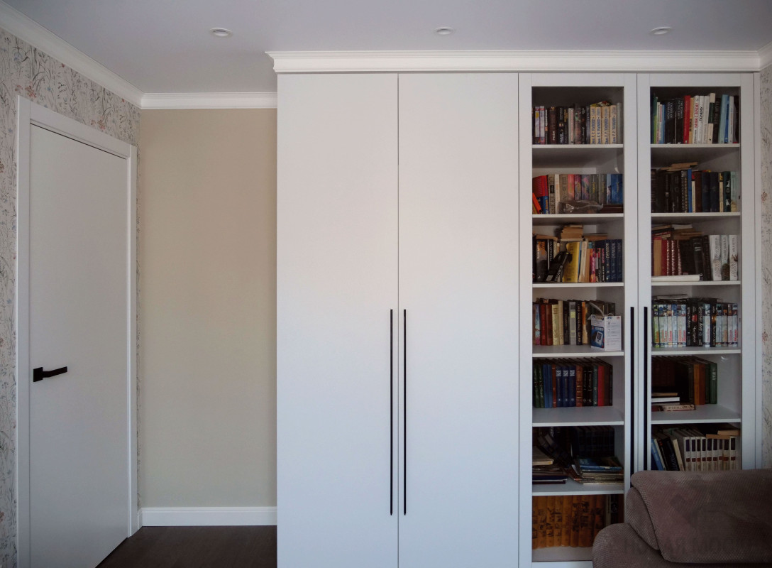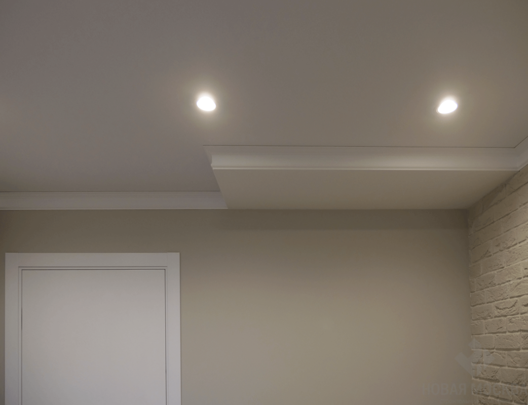 На всей площади квартиры установили натяжные потолки, из гипсокартона выполнили только ниши для штор, корпусной мебели и потолочных карнизов.