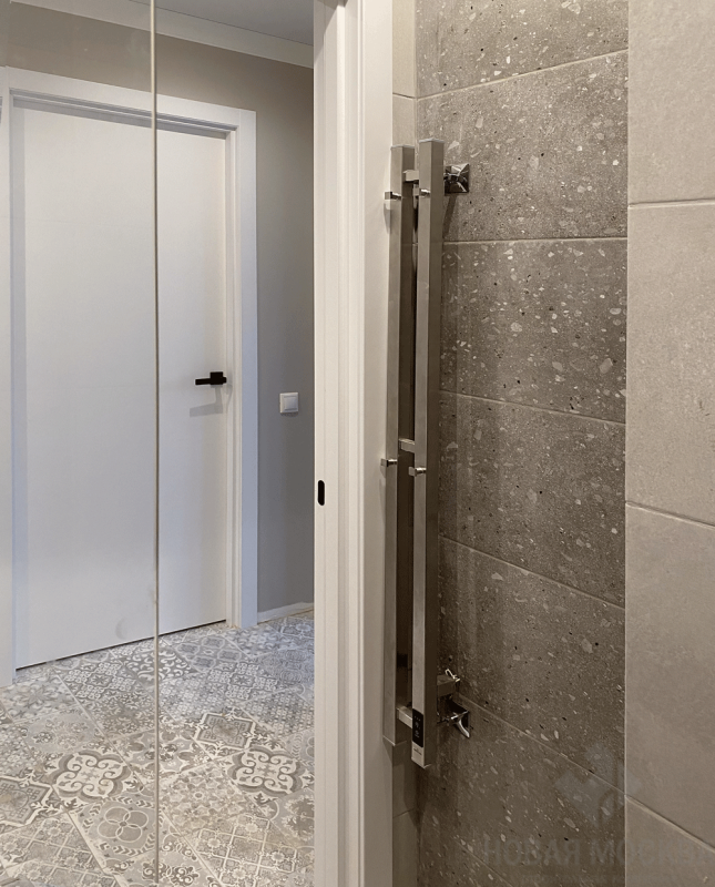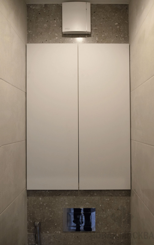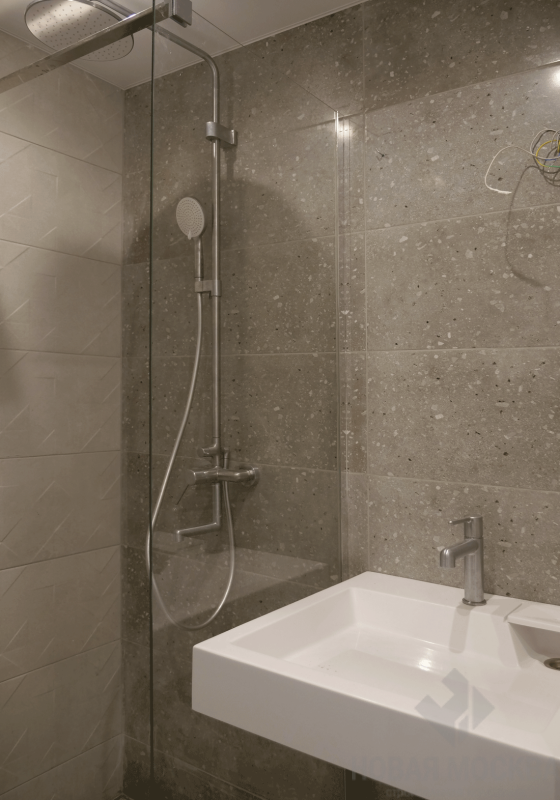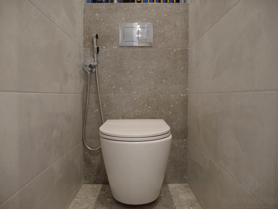 Раздельный санузел отделали керамогранитом, в ванной произвели монтаж душевой в строительном исполнении и подвесной сантехники.