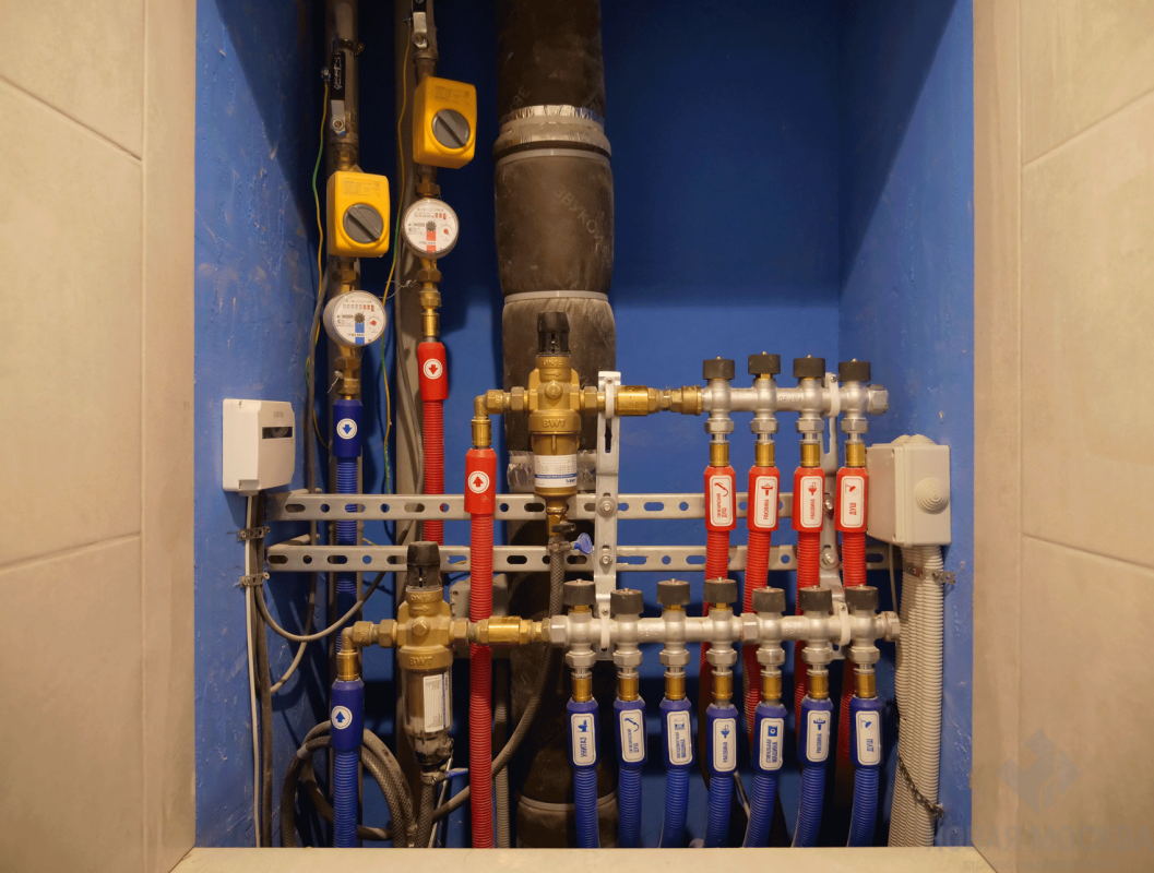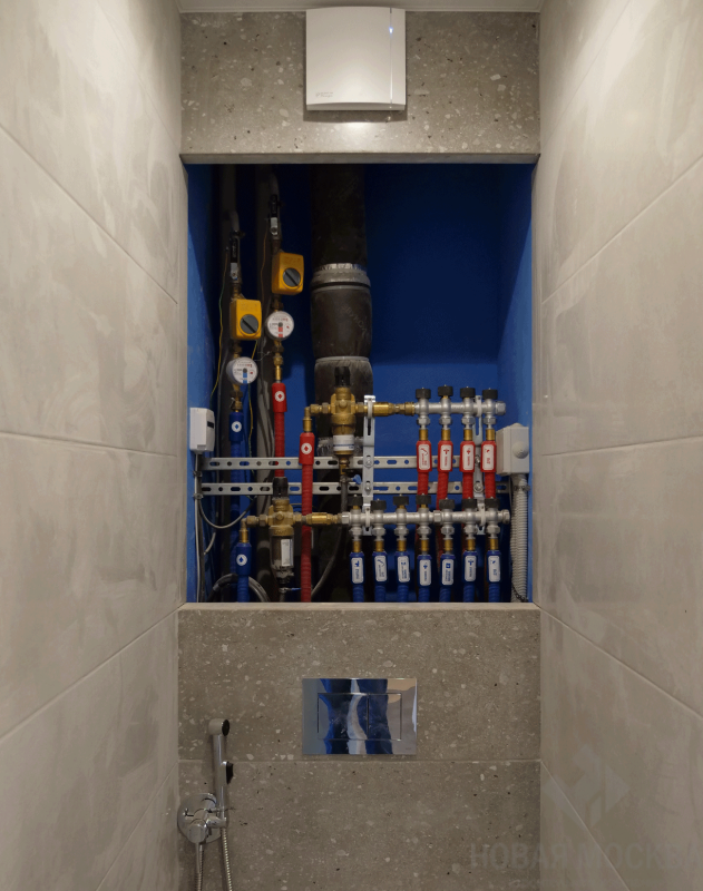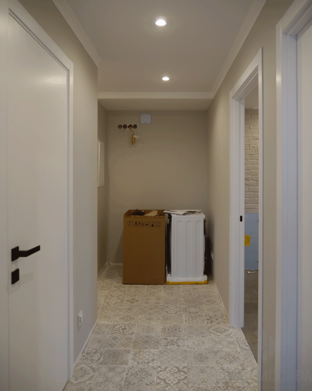 Жилье расположено в доме 1960-х годов и требовало модернизации электрики, водоснабжения, канализации, отопления и вентиляции. Строительная бригада произвела замену старых коммуникаций на новые согласно ранее разработанному дизайн-проекту.