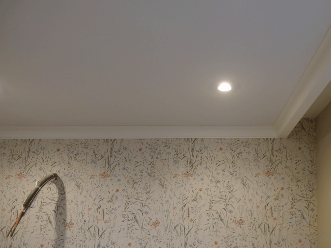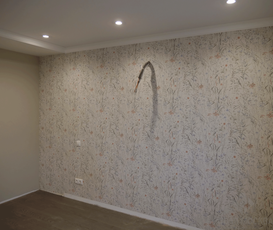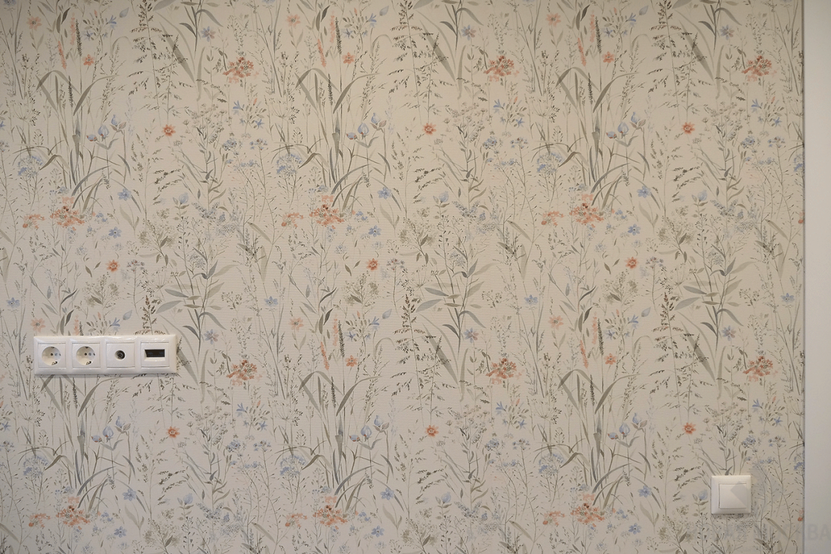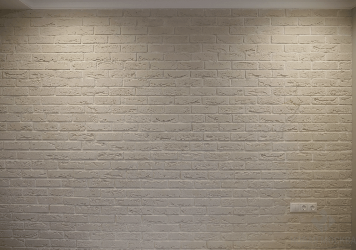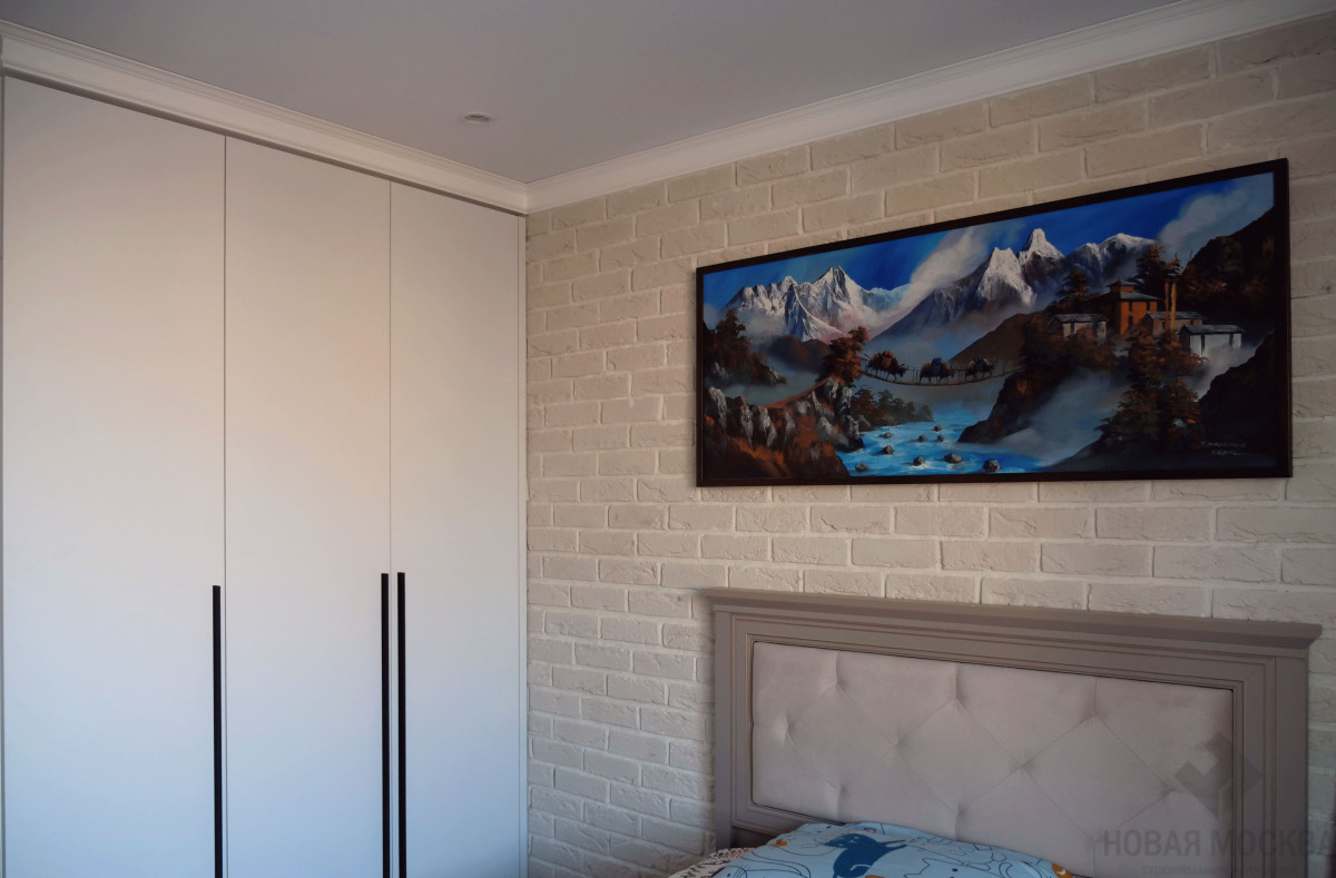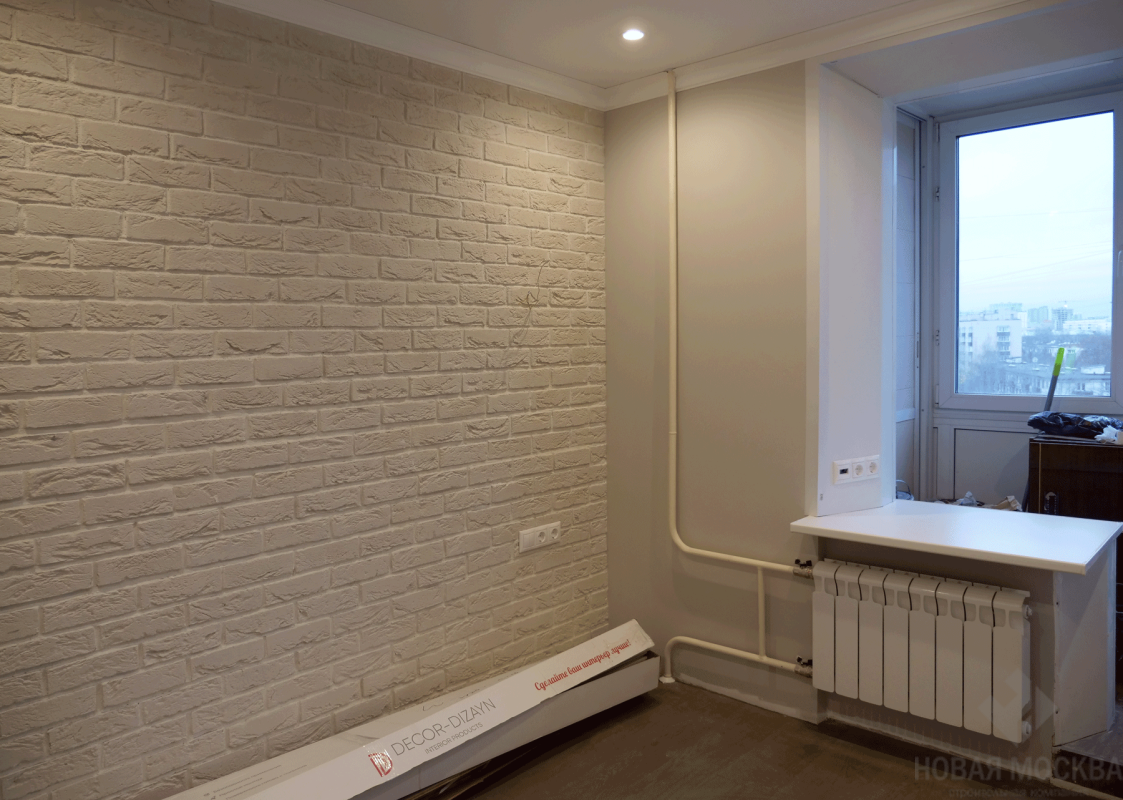 Стены выровняли, подготовили под отделку, большую часть стен в помещениях покрасили. Акцентные стены на кухне и в гостиной оклеили обоями, а в спальне отделали искусственным камнем с имитацией кирпичной кладки, предусмотрели шумоизоляцию.