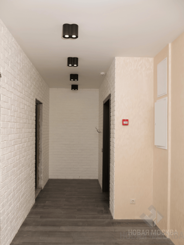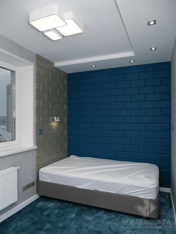 Выполнить ремонт трехкомнатной квартиры в новостройке. Жилье подвергнуть перепланировке, в результате которой для двоих разнополых детей организовать две изолированные комнаты. За счет смещения санузла к коридору добавить холл, где устроить рабочее место. Кухню-столовую объединить с гостиной. В спальне заказчиков выделить гардеробную. В отделке применить современные и традиционные материалы: плитку, обои, краску, гипсовые 3D-панели, мягкие стеновые панели, декоративную штукатурку, облицовочный кирпич, ковролин, инженерную доску, деревянные балки.